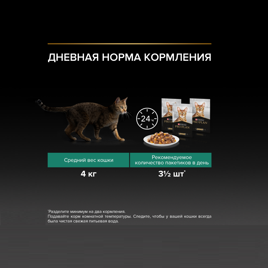 | Дополнительная информация | индивидуальные потребности кошки могут варьироваться, и ежедневное количество корма должно быть скорректировано в соответствии с необходимостью поддержания оптимального веса кошки; подавайте корм комнатной температуры; следите, чтобы у вашей кошки всегда была чистая свежая питьевая вода |