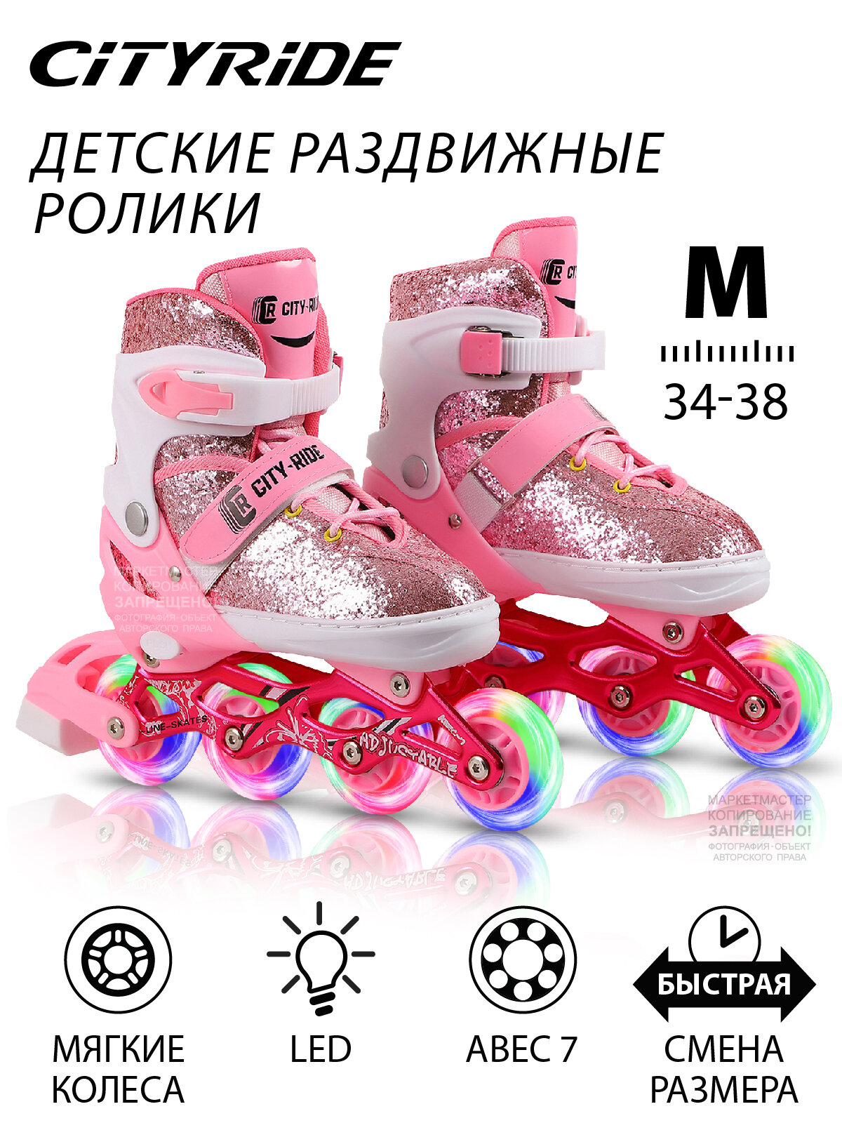 Роликовые коньки детские CITYRIDE, PU колеса/все светятся, подшипники ABEC 7, размер М (34-38), раздвижные, JB8800086