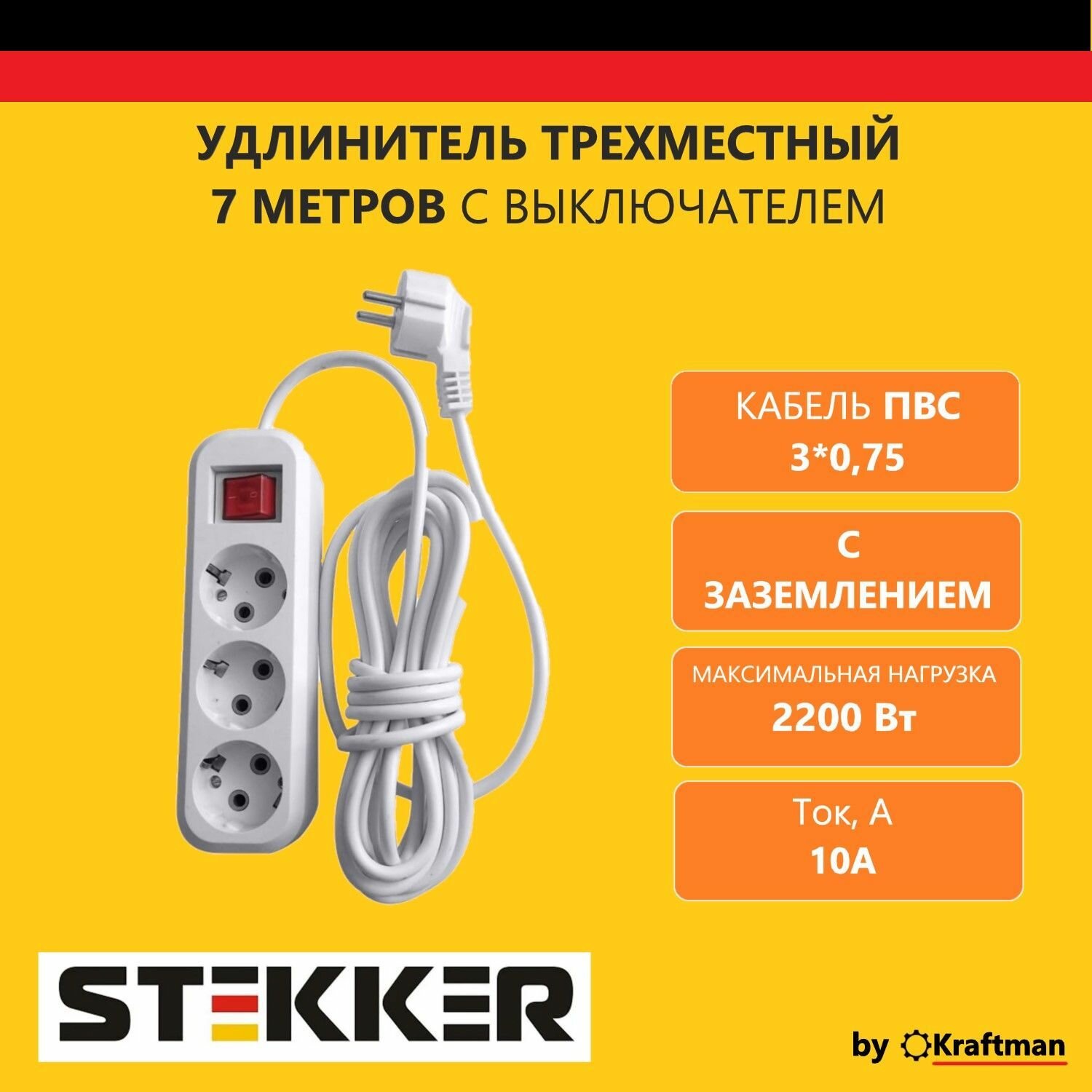 3-местный удлинитель Stekker с заземлением с выключателем, 3x0,75мм2, 3м, 10А, У10а-002, белый HM03- .