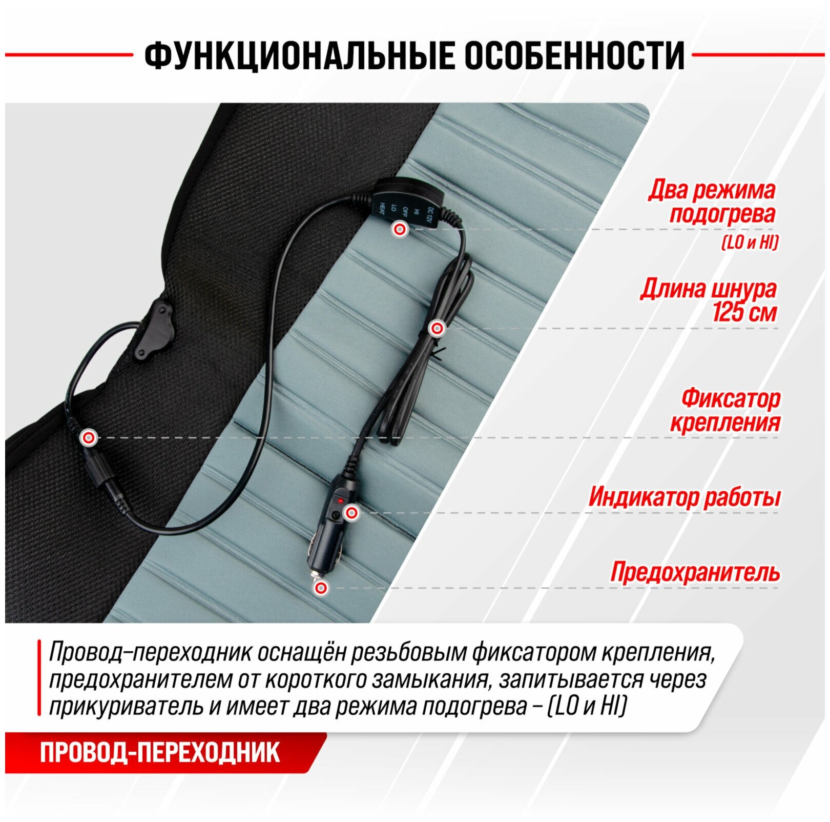 | Дополнительная информация | Подогрев: спинка + сиденье. Питание - от прикуривателя |