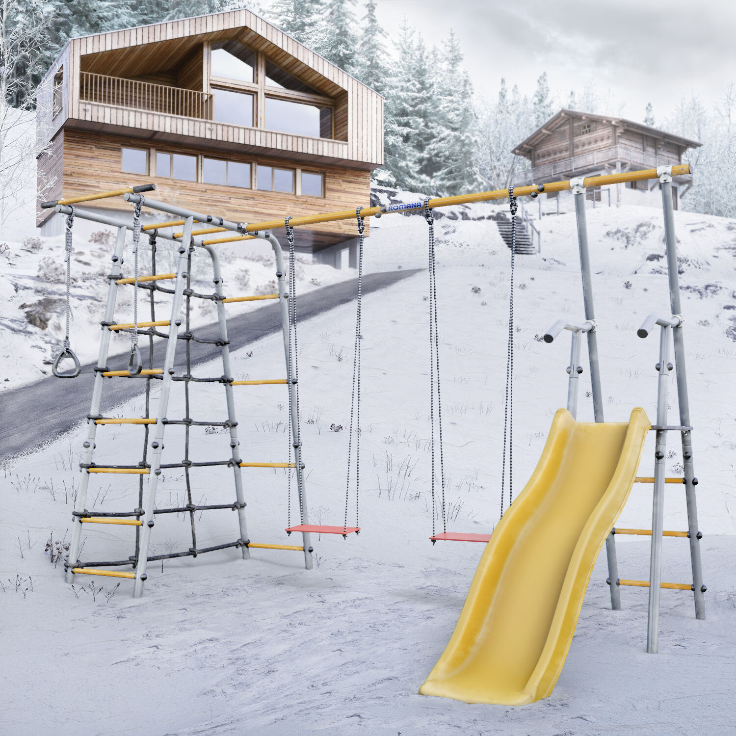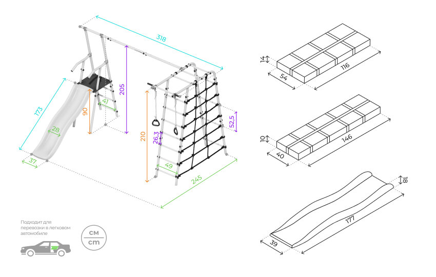 | В комплекте | веревочная лестница, гимнастические кольца, горка, качели, рукоход, сетка для лазания, турник |