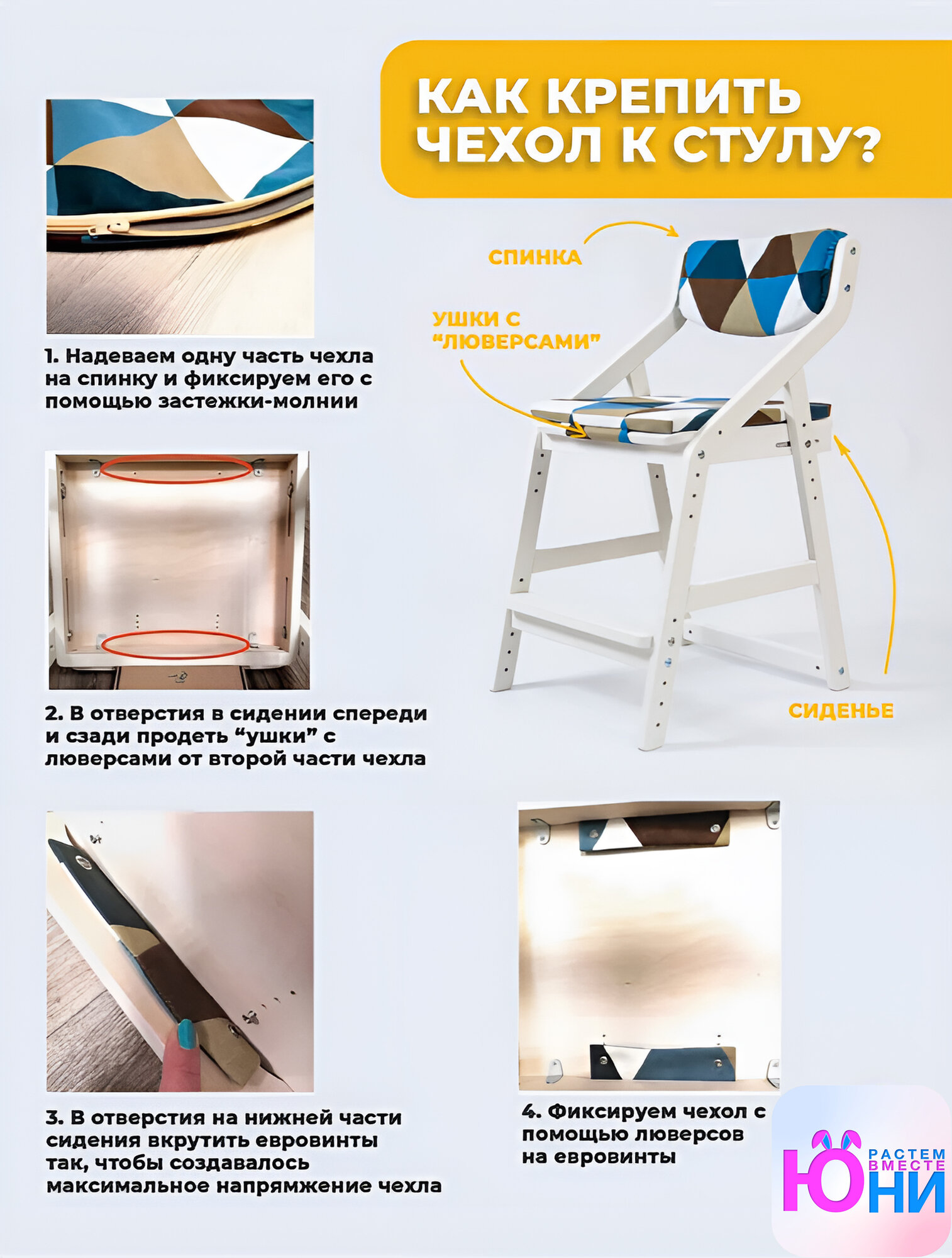 Стул детский регулируемый по высоте для школьника "Робин WOOD" Белый с чехлом Ромбусы интересное: