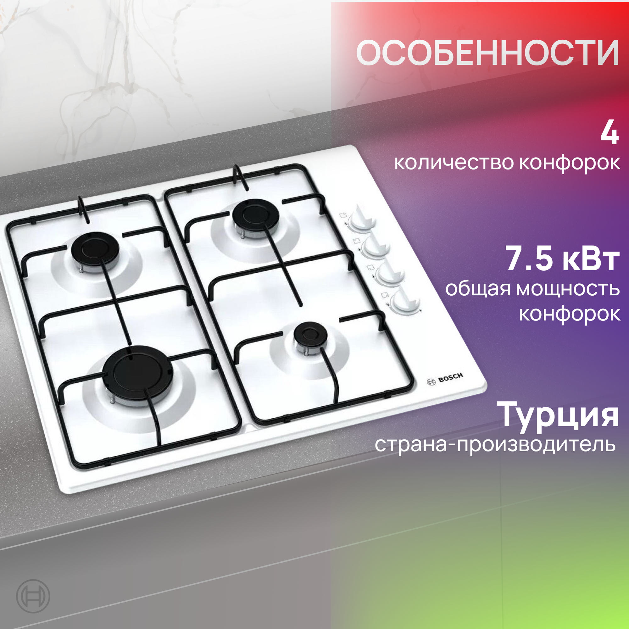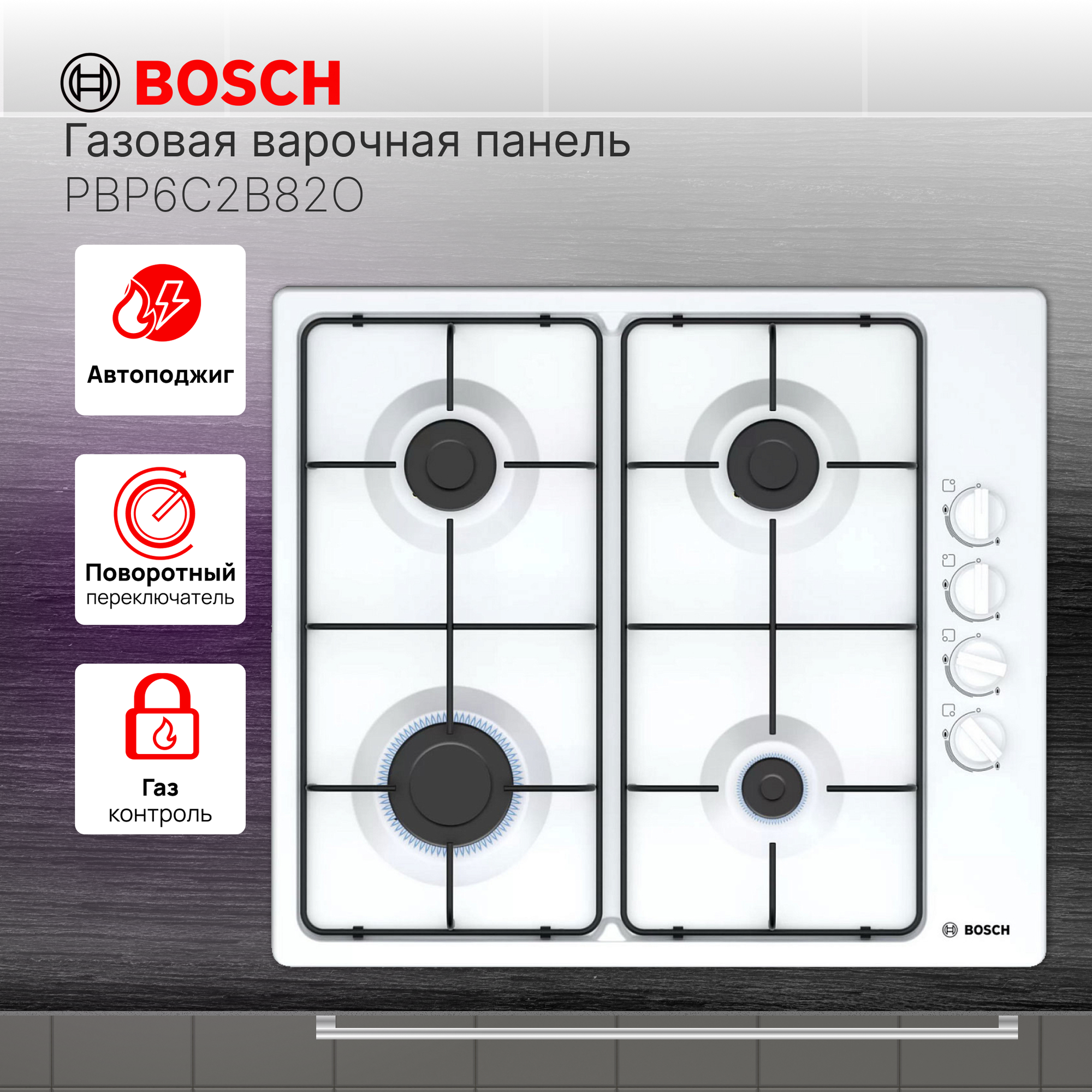 Газовая варочная поверхность Bosch Pbp6c2b82o белый Pbp6c2b82o .