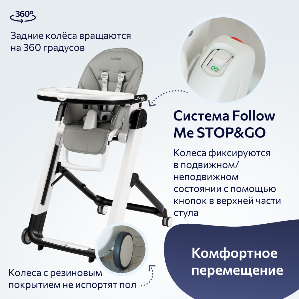 Стульчик для кормления Peg-Perego Tatamia Follow Me на колесах, регулировка спинки, сиденья и подножки, съемный столик, Ice серый New