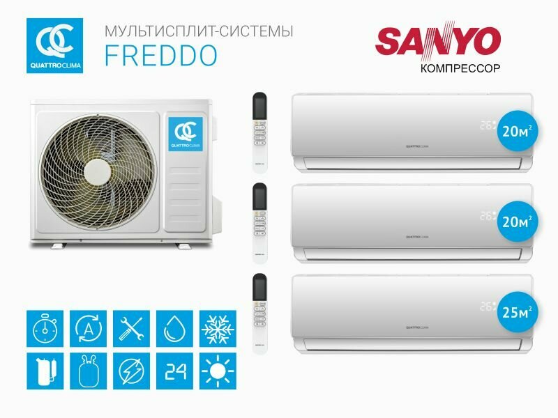 Мульти сплит-система на 3 комнаты QUATTROCLIMA QN-FM21UA + QV-FM07WA*2 шт. + QV-FM09WA (20 м2 + 20м2 + 25м2) интересное:
