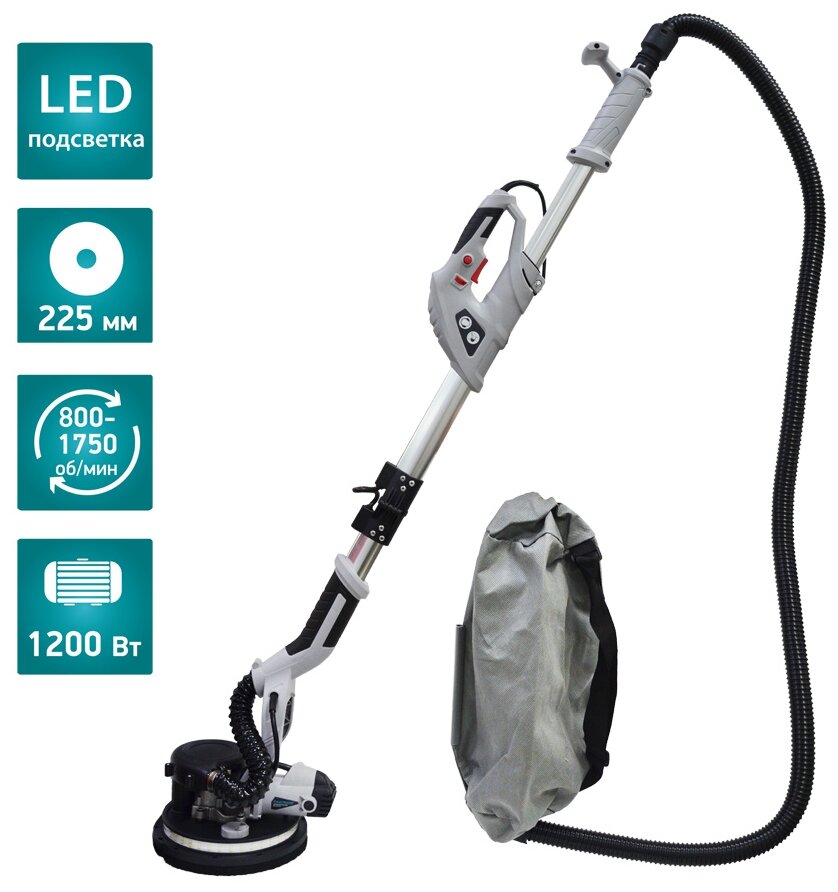 Шлифовальная машинка для стен и потолка жираф ELECTROLITE ШМ 1200 ( 1200 Вт, LED-Подсветка, Об/мин 800-1750, Круг 225 мм, Длина телескопической штанги 1,2 М-1,7 М, пылесос)