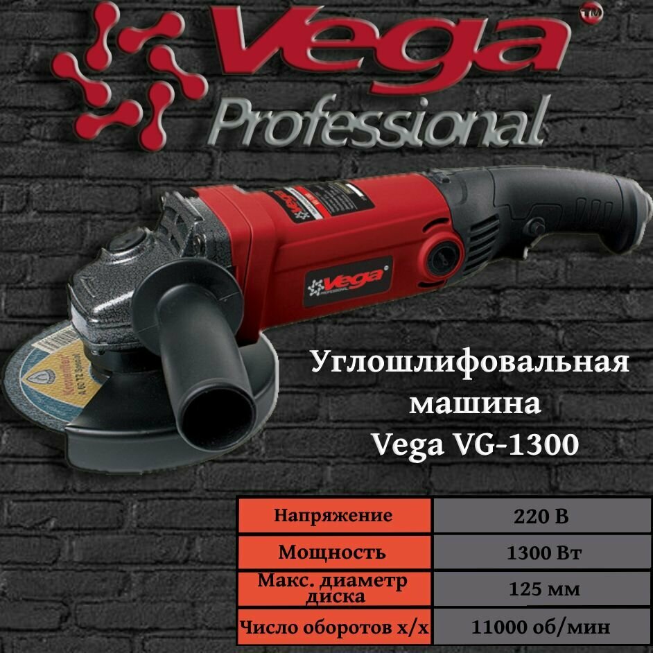 Углошлифовальная машина болгарка Vega Professional VG 1300, 125мм круг, 1300Вт, 11000об/мин /