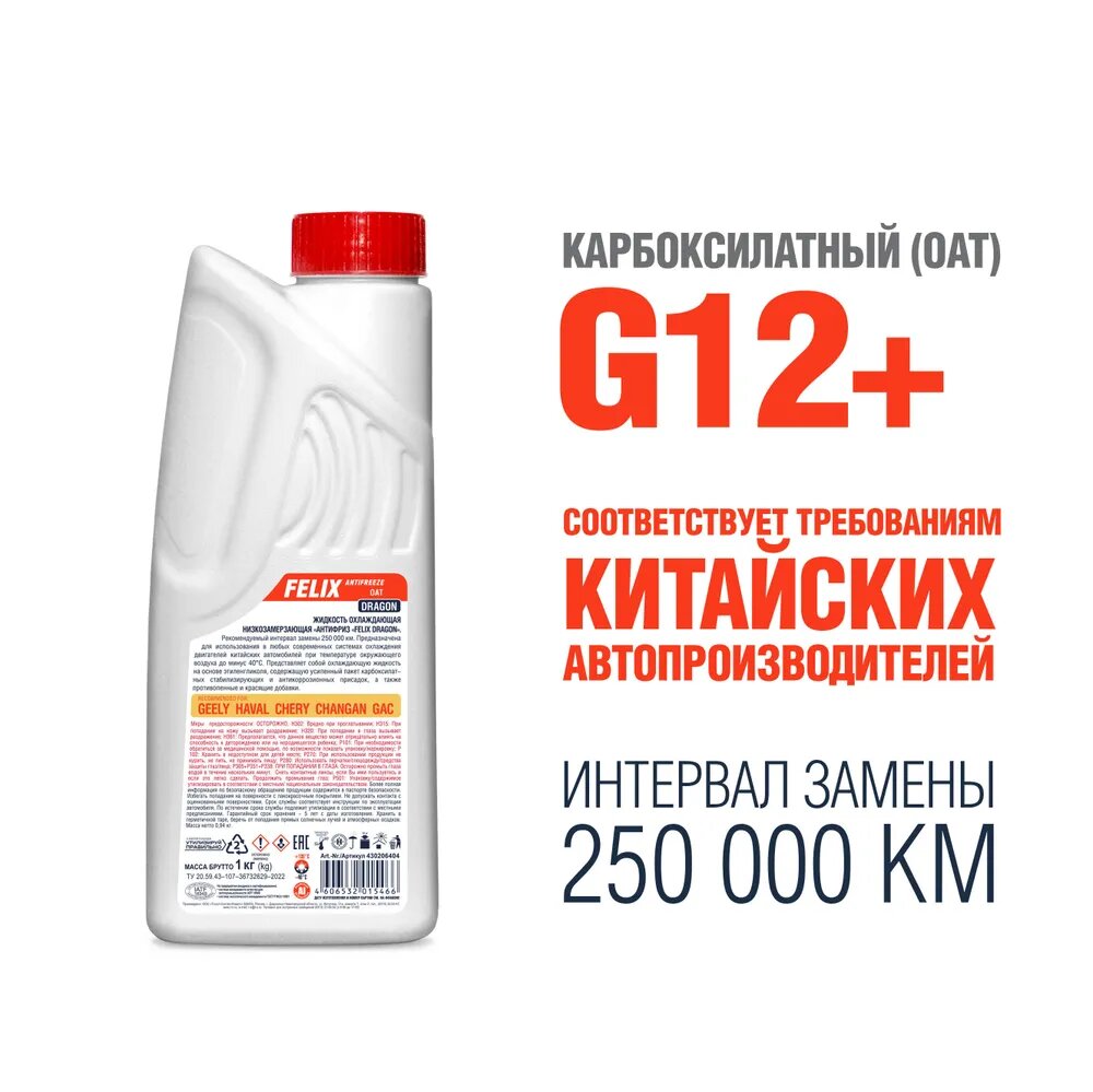 Антифриз FELIX "DRAGON" для китайских авто, -45С, G12+, 1 кг, новинка!