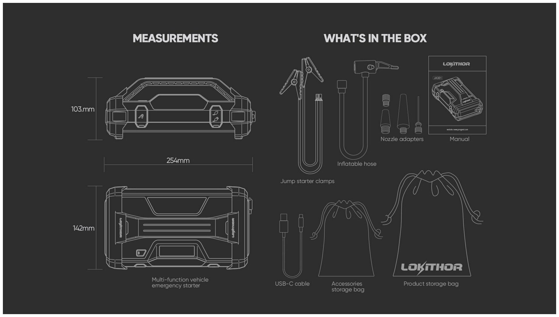 Автомобильное Пуско-зарядное устройство JumpStarter JA301 Lokithor 74Wh, 2000A. 4в1, интересное: