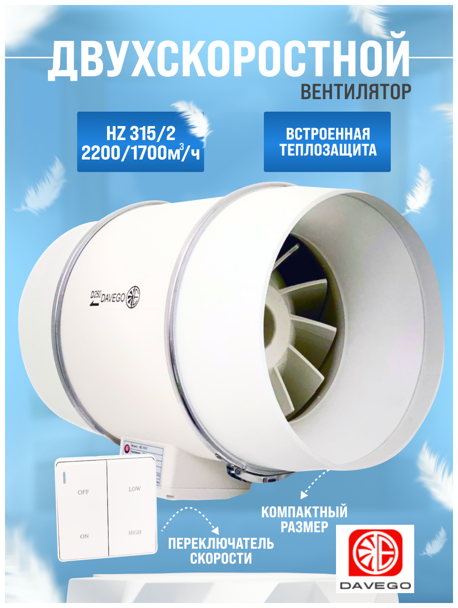 Вентилятор канальный пластиковый HZ-315/2 DAVEGO двухскоростной интересное: