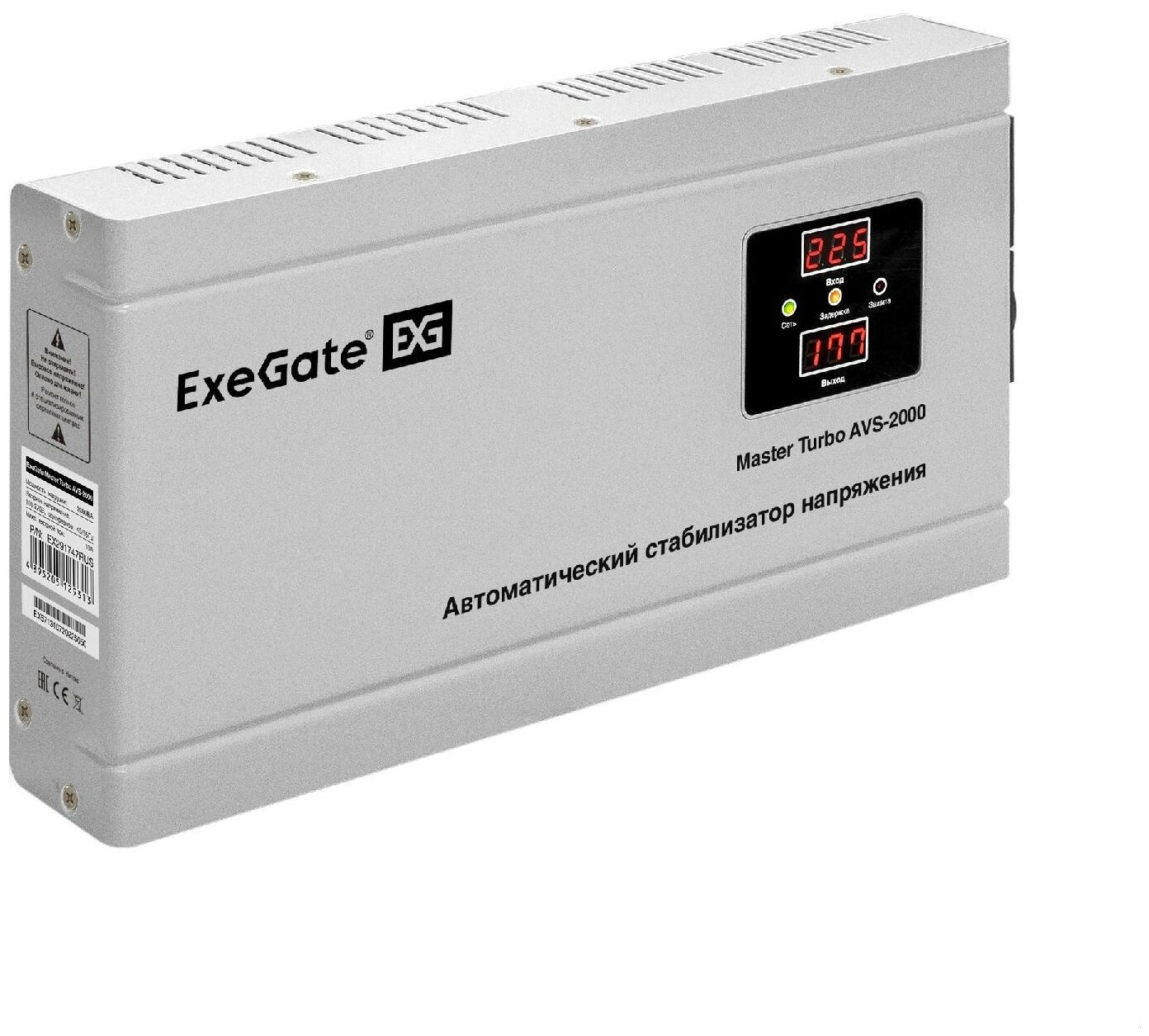 Стабилизатор напряжения настенный ExeGate Master Turbo AVS-2000 (2000ВА, вход 100-265В, цифр. индикация вход/вых. напряжения, выход 220В±10%, КПД 98%, 5 уровней защиты, задержка, усиленный метал. корпус, 1*Schuko, RTL) EX291747RUS