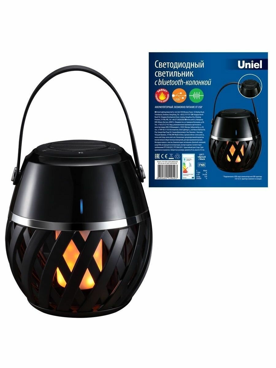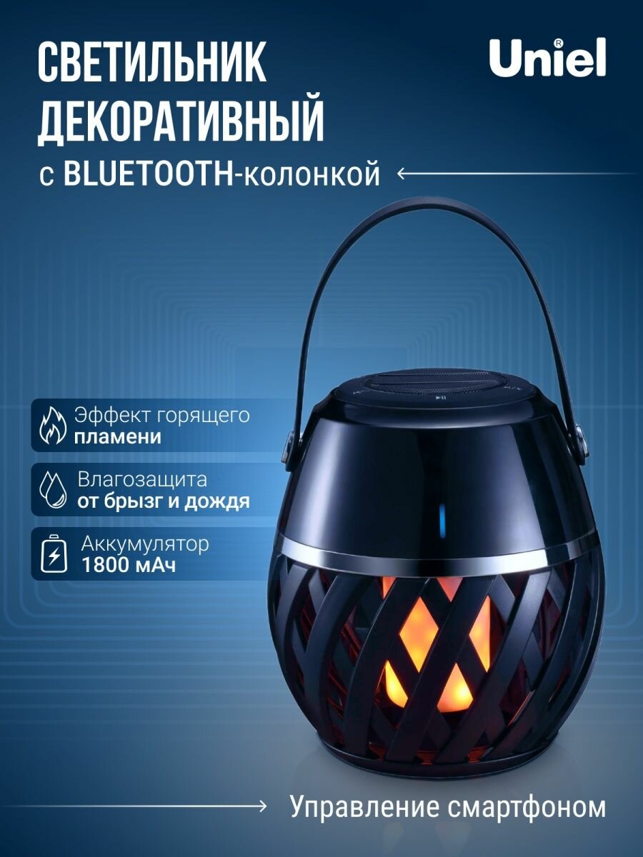 Типы/Уличное освещение/Фонарики Uniel ULD-R201 LED/FLAME BLACK Светодиодный светильник с bluetooth колонкой 75db. Эффект пламени. Встроенный аккумулятор 1800mAh. Черный. ТМ Uniel