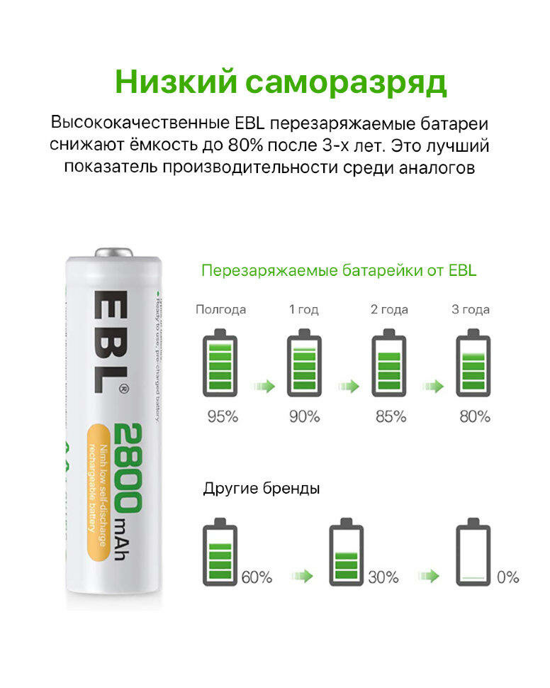 Комплект аккумуляторных батарей EBL AA 2800mAh (4шт) интересное: