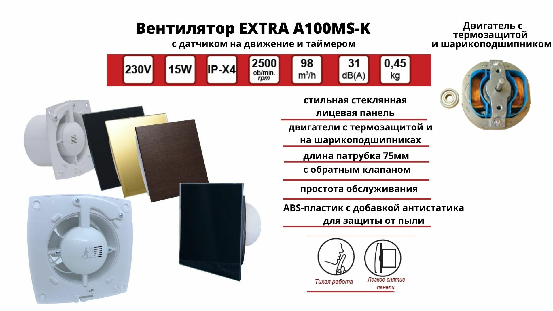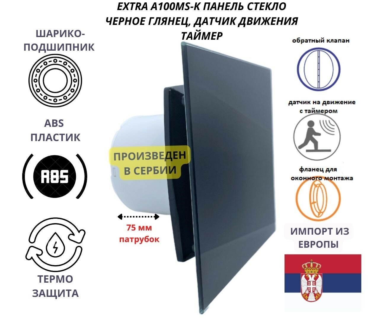Вентилятор D100мм с датчиком движения и таймером, фланцем и обратным клапаном EXTRA A100MS-K (Сербия), стеклянная панель цвета черный глянец. интересное: