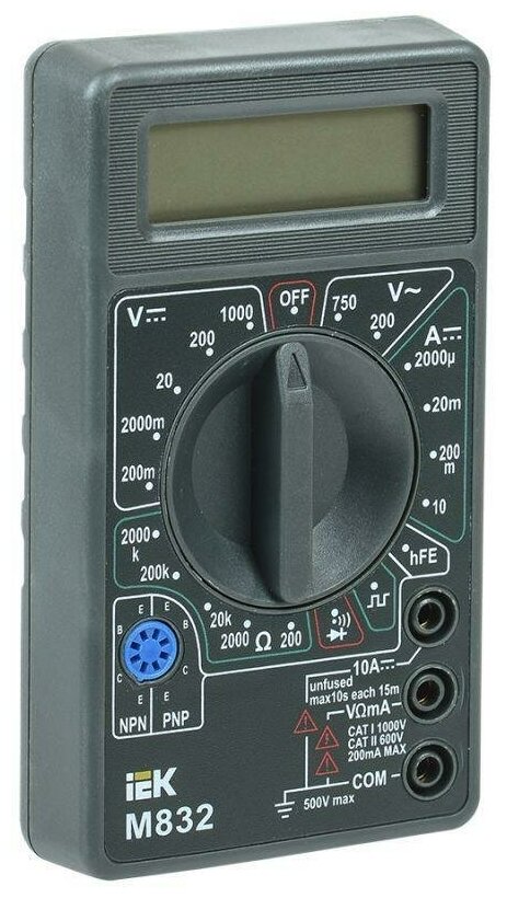 | Дополнительная информация | Все пределы защищены от перегрузок; - 20-позиционный переключатель режимов работы и пределов; - Постоянное напряжение, DCV: 200 м-2-20-200-1000 В; - Переменное напряжение,ACV: 20-750 В; - Постоянный ток, DCA: 200-2000 мк-20 м-200 мк-10 А; - Сопротивление, OHM: 200-2000 мк-20 м-200 мк-10 А. |