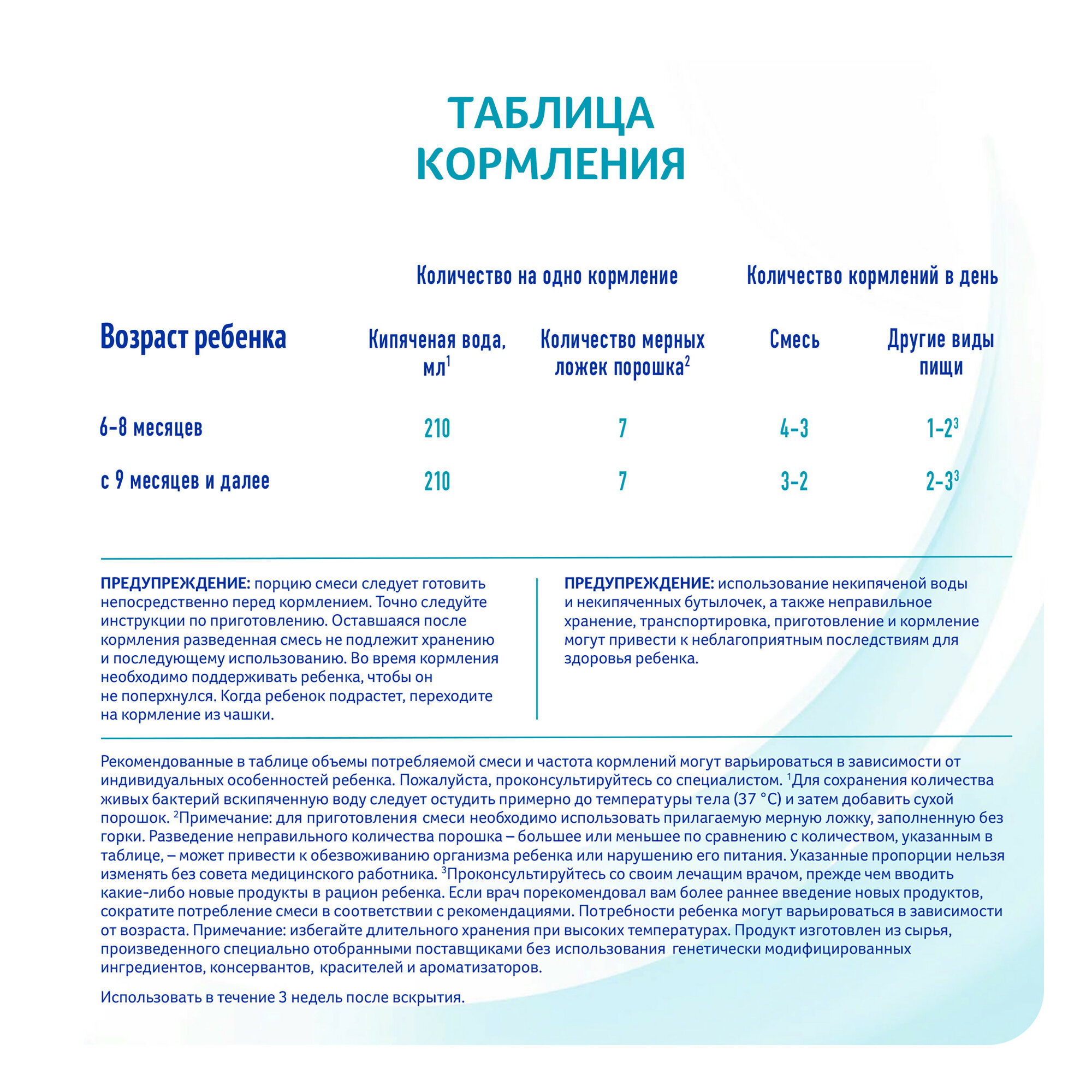 | Дополнительная информация | порцию смеси следует готовить непосредственно перед кормлением; точно следуйте инструкции по приготовлению; оставшаяся после кормления разведенная смесь не подлежит хранению и последующему использованию; до и после вскрытия хранить при температуре не выше 25 °С и относительной влажности воздуха не более 75%; содержимое банки должно быть использовано в течение 3-х недель после вскрытия, не рекомендуется хранить в холодильнике; дата изготовления (MAN), годен до (EXP) и номер партии указаны на дне банки |