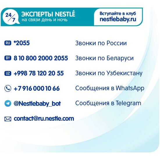 | Дополнительная информация | порцию смеси следует готовить непосредственно перед кормлением; точно следуйте инструкции по приготовлению; оставшаяся после кормления разведенная смесь не подлежит хранению и последующему использованию; до и после вскрытия хранить при температуре не выше 25 °С и относительной влажности воздуха не более 75%; содержимое банки должно быть использовано в течение 3-х недель после вскрытия, не рекомендуется хранить в холодильнике; дата изготовления (MAN), годен до (EXP) и номер партии указаны на дне банки |