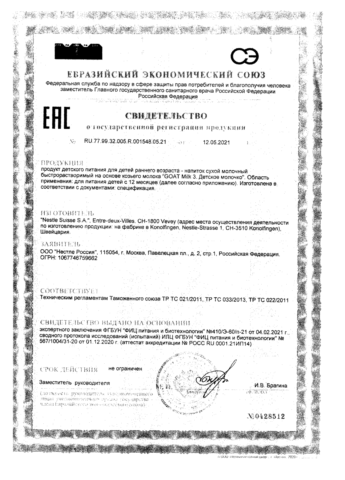 | Состав | сыворотка сухая деминерализованная из козьего молока, молоко козье цельное сухое, смесь растительных масел (рапсовое низкоэруковое, подсолнечное, подсолнечное высокоолеиновое, кокосовое), лактоза, масляная смесь с DHA (подсолнечное масло, рыбий жир), кальциевая соль ортофосфорной кислоты (фосфат кальция), эмульгатор соевый лецитин, цитрат натрия, лактобактерии L. Reuteri (не менее 1х106 КОЕ/г), регулятор кислотности гидроксид натрия, нуклеотиды |