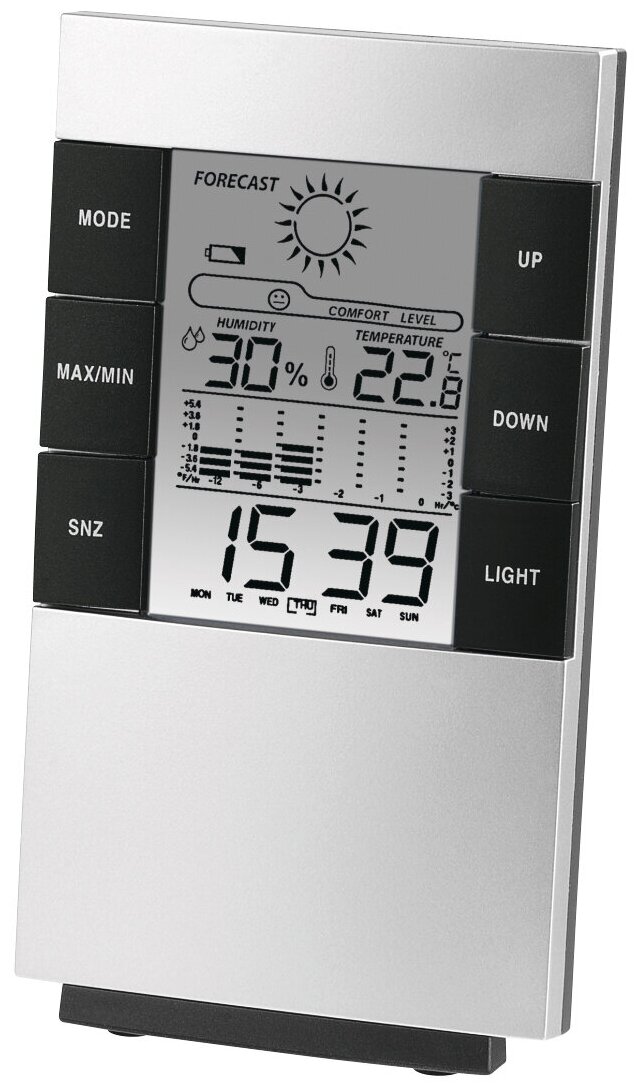 - ценой (270 р. в интернет-магазине) - гигрометр, термометр, часы-будильник и простейший барометр за указанные деньги. - хорошо читаемый экран с голубой подсветкой - крепление на столе или на стене - питается от 2 ААА (поставил 2 аккумулятора) |