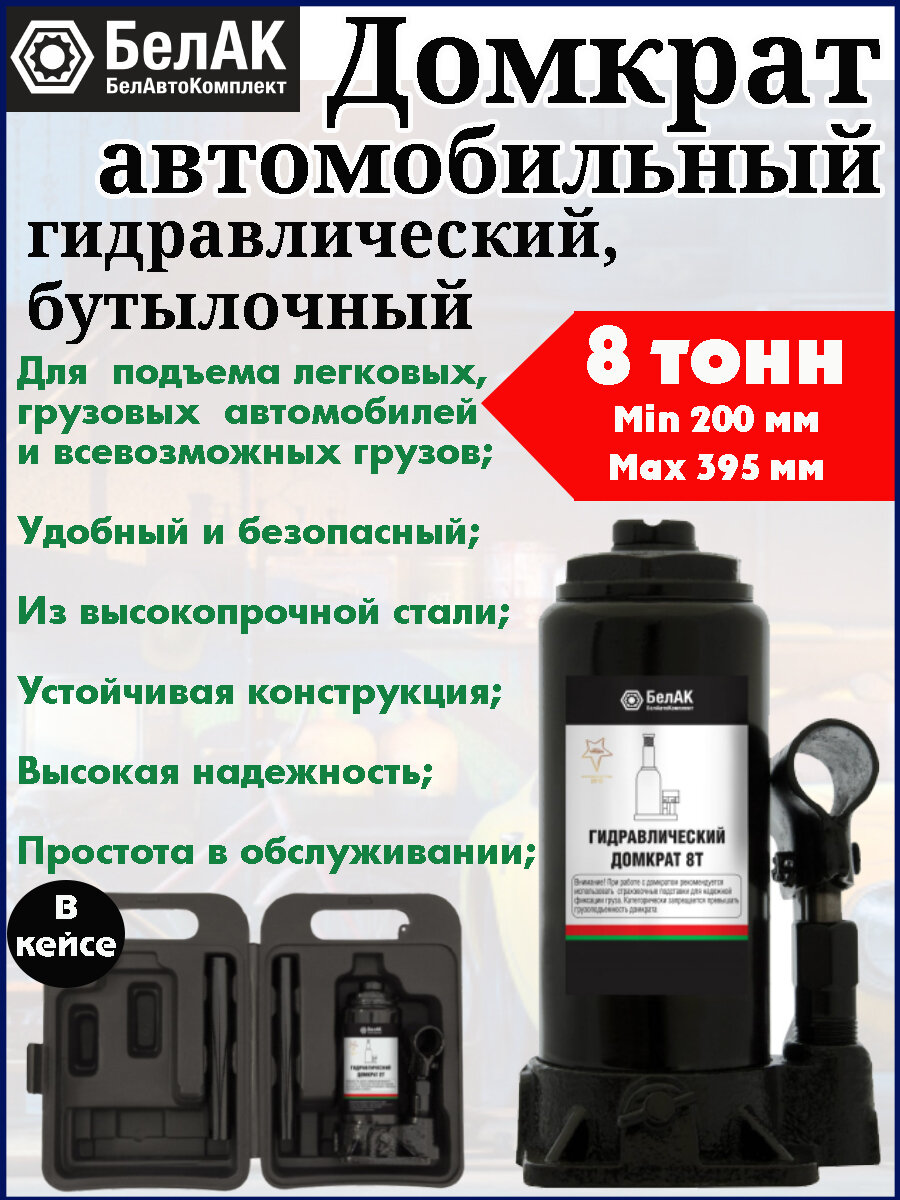 Домкрат автомобильный БелАК, гидравлический, бутылочный, в кейсе, 8 тонн интересное:
