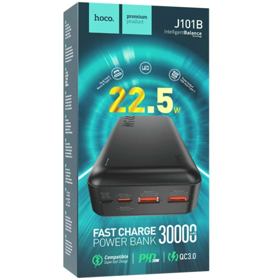 Универсальный Доп. Аккумулятор 30000mAh, J101B, HOCO, выход: 2 USB (22.5W)+1 PD (20W), черный
