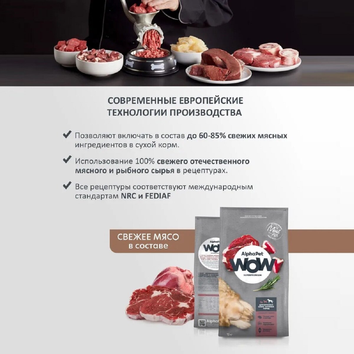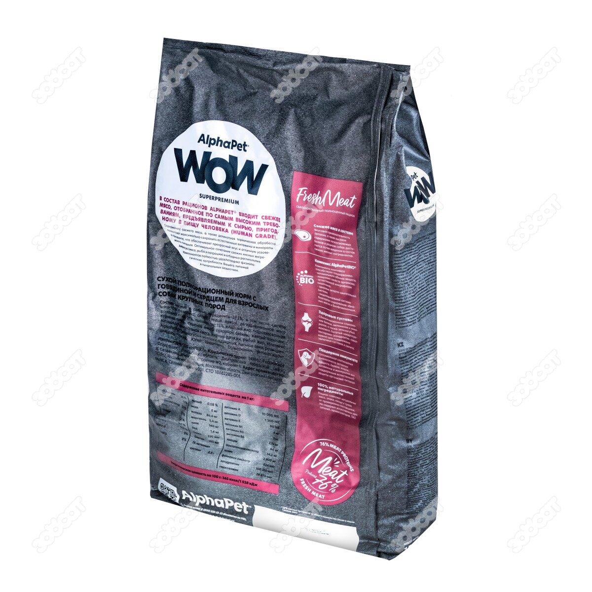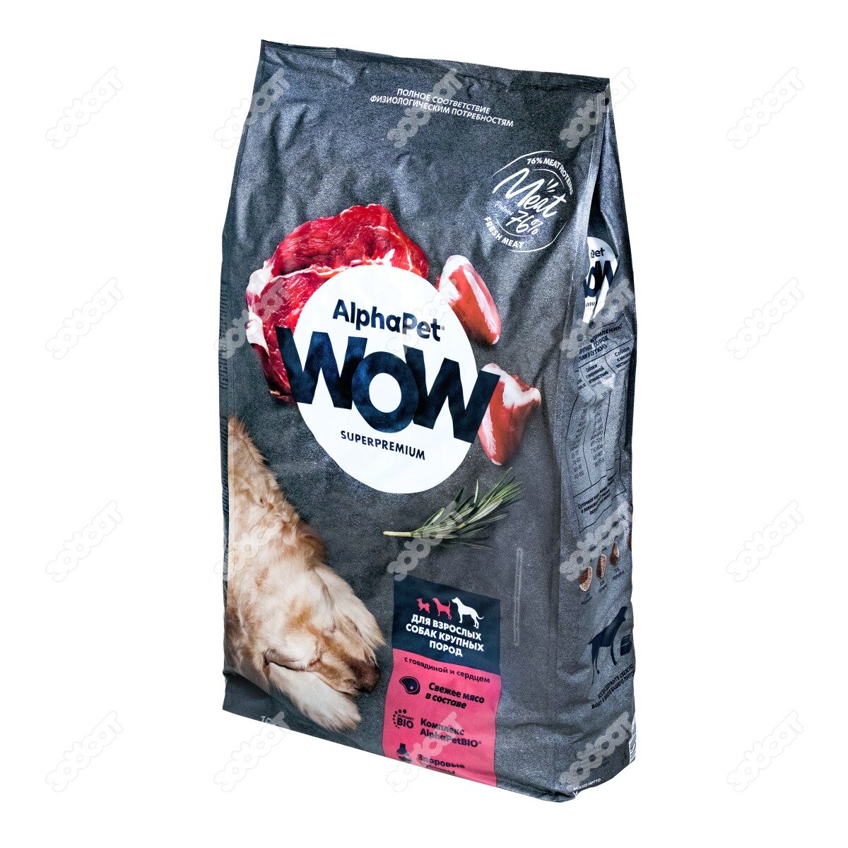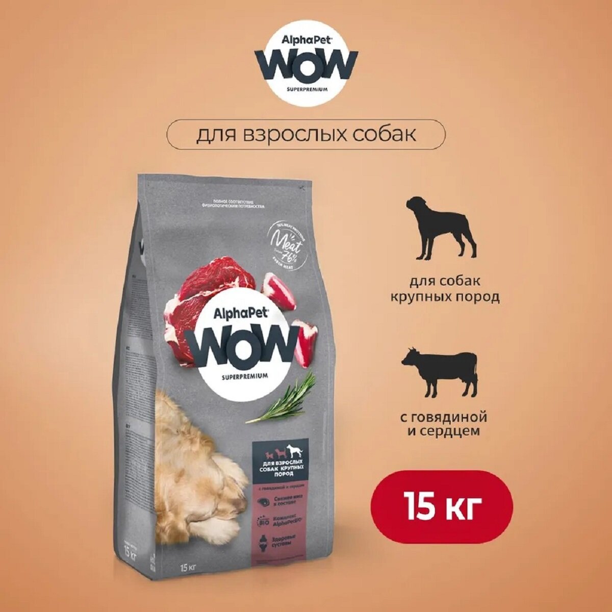 Купить Сухой полнорационный корм с говядиной и сердцем для взрослых собак крупных пород AlphaPet WOW Superpremium 15 кг
