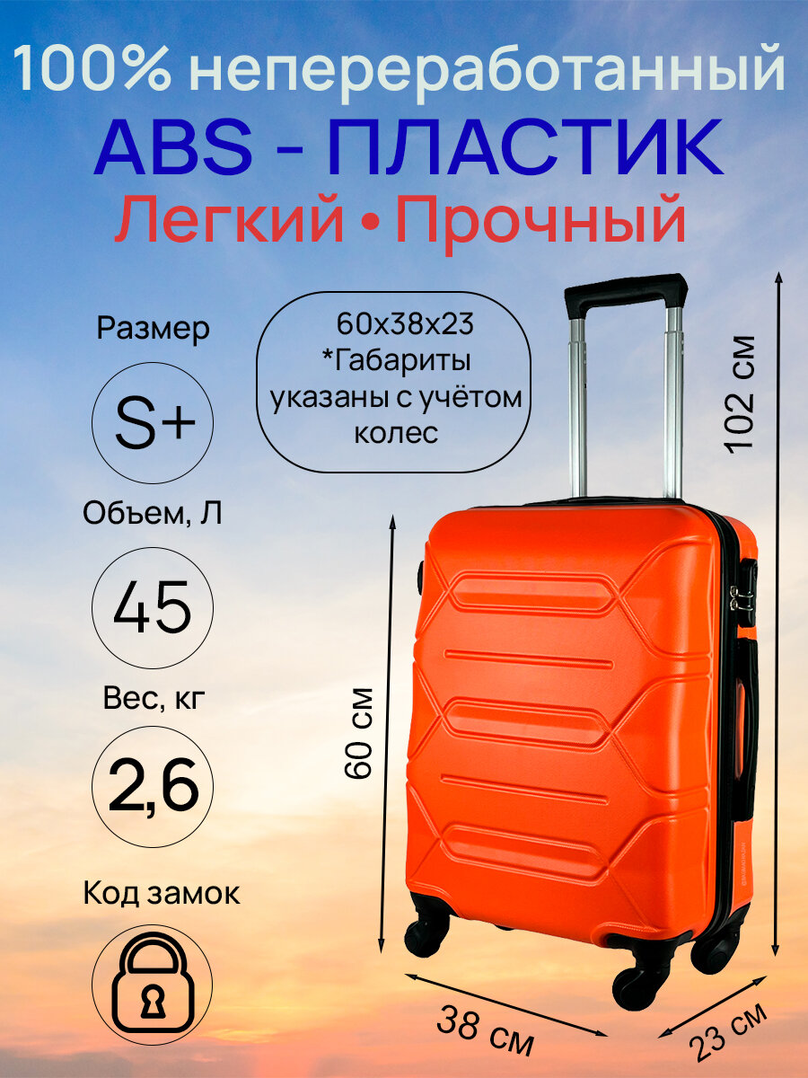 Чемодан, Размер S+, 45 литров, Габариты: 60x38x23, съемные колеса, кодовый замок, 4 колеса, цвет: Оранжевый
