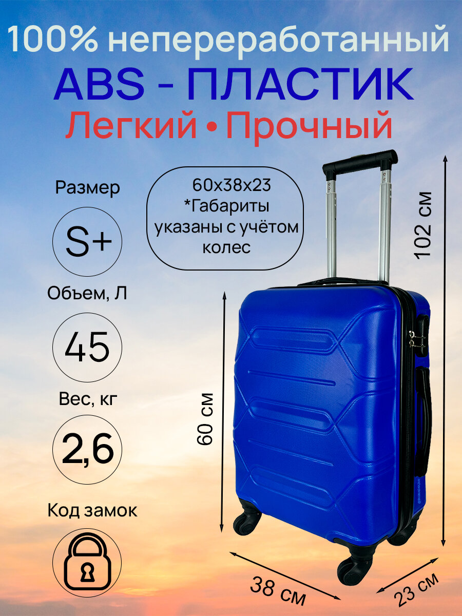 Чемодан, Размер S+, 45 литров, Габариты: 60x38x23, съемные колеса, кодовый замок, 4 колеса, цвет: Синий