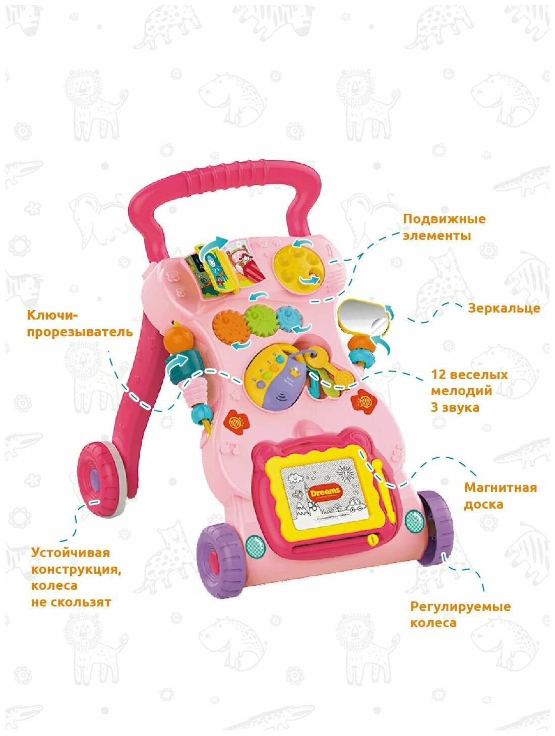 Каталка-ходунок HE0823 Levatoys с доской для рисования, в коробке интересное: