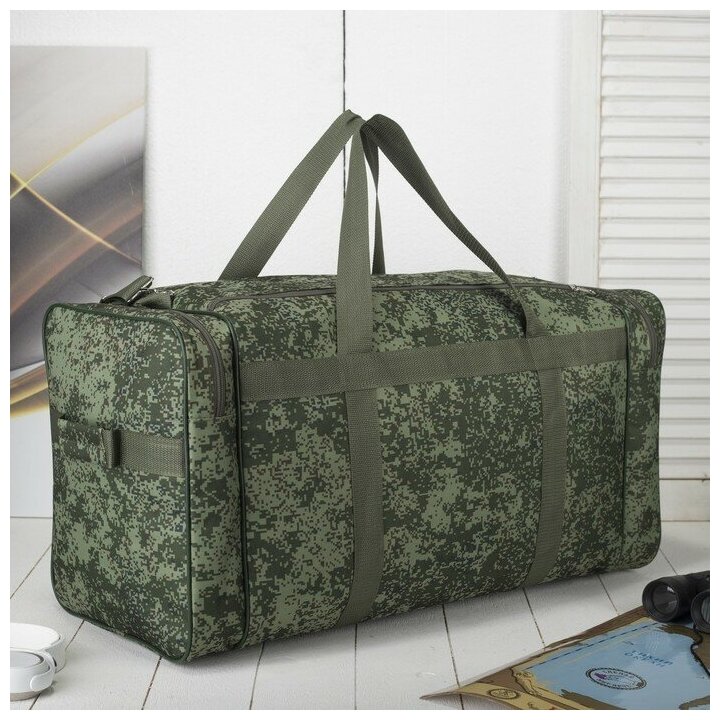 Зфтс Сумка дорожная на молнии, 3 наружных кармана, длинный ремень, цвет камуфляж/зелёный