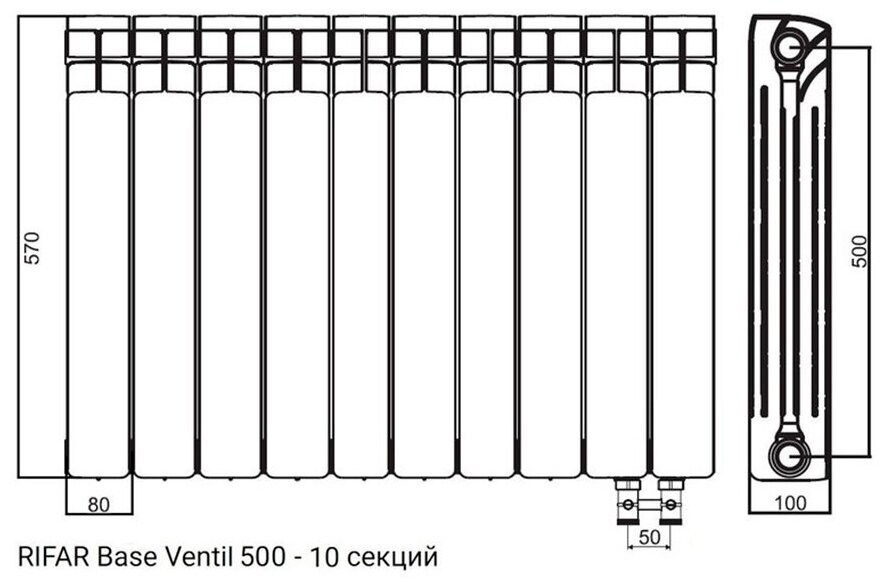радиатор секционный биметаллический RIFAR Base Ventil BVR 500 10 секций с нижним правым подключением