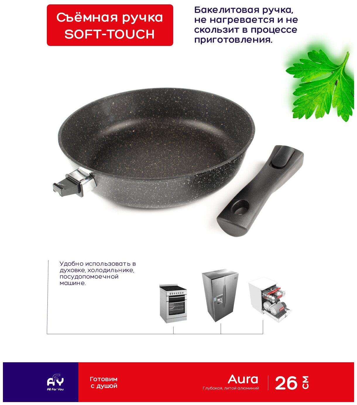 Сковорода AFY Aura, 26 см, глубокая, съёмная ручка, литой алюминий, антипригарное покрытие интересное: