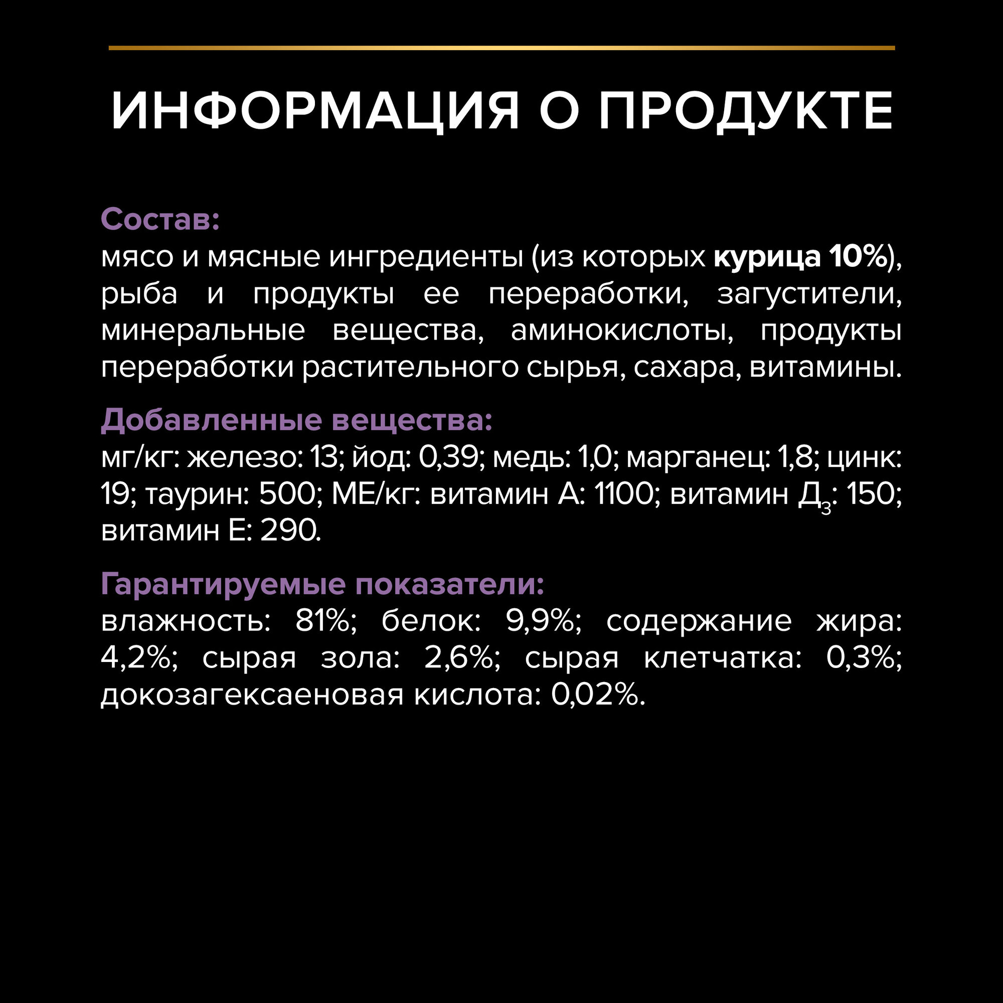 | Дополнительная информация | количество корма и/или время кормления могут быть скорректированы в зависимости от уровня его активности и роста; для беременных или кормящих кошек: кормите столько, сколько кошка сможет съесть, но не менее 3 пакетиков во время беременности и 5 пакетиков в период лактации/ кормления; подавайте корм комнатной температуры; следите, чтобы у вашей кошки всегда была чистая свежая питьевая вода |