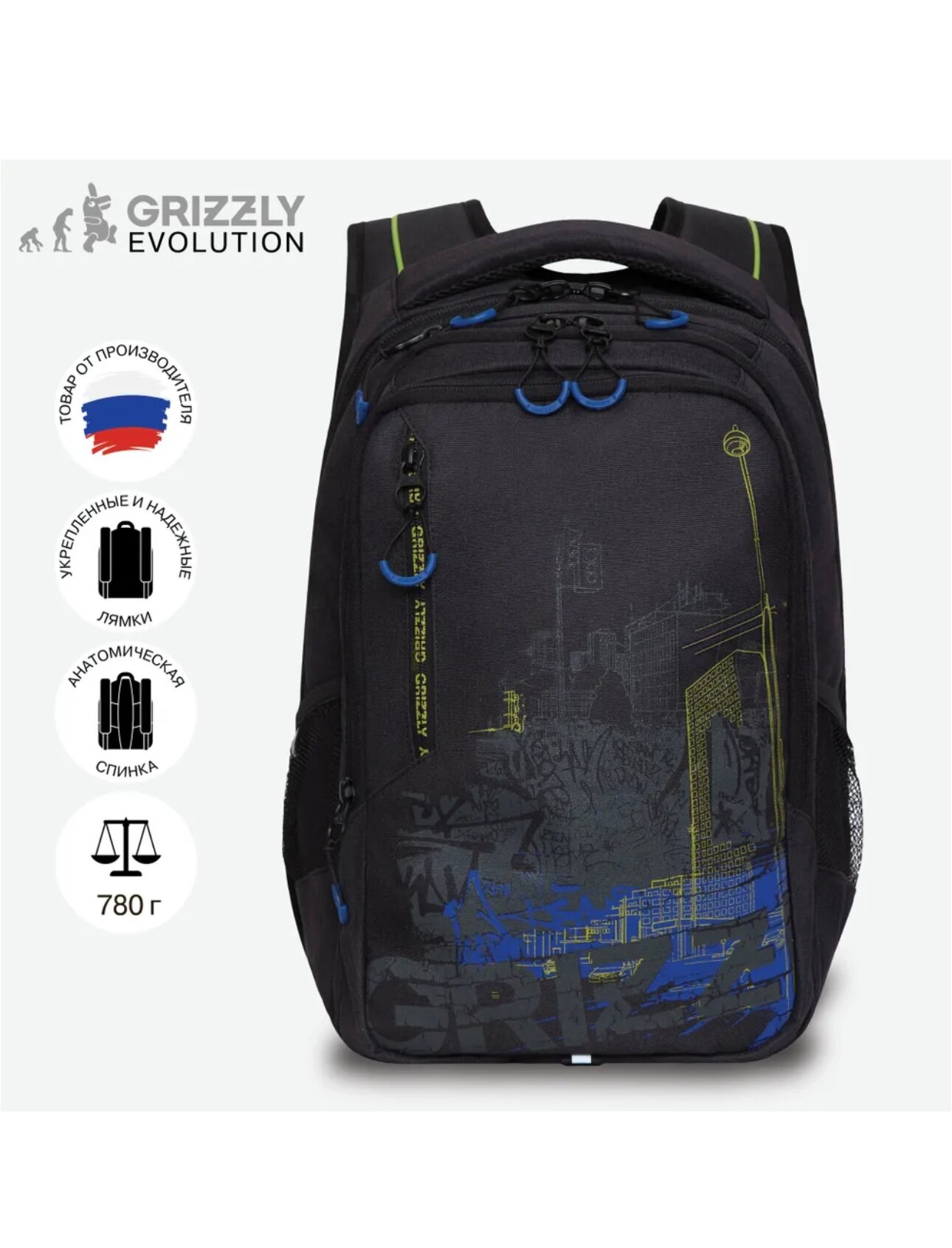 Рюкзак молодёжный, 42 х 31 х 22 см, Grizzly 338, эргономичная спинка, отделение для ноутбука, чёрный .