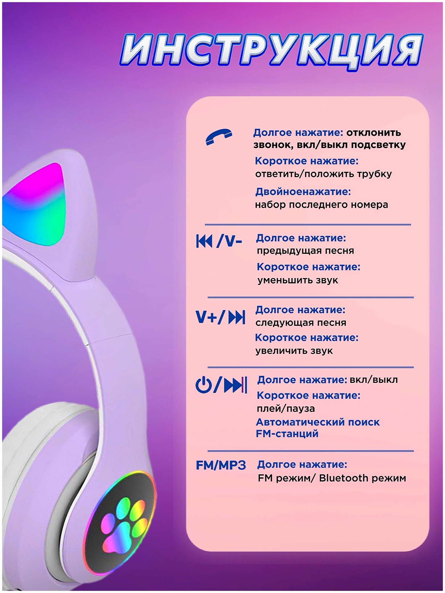 Беспроводные наушники с ушками кошки / наушники детские / светящиеся наушники (розовые) интересное: