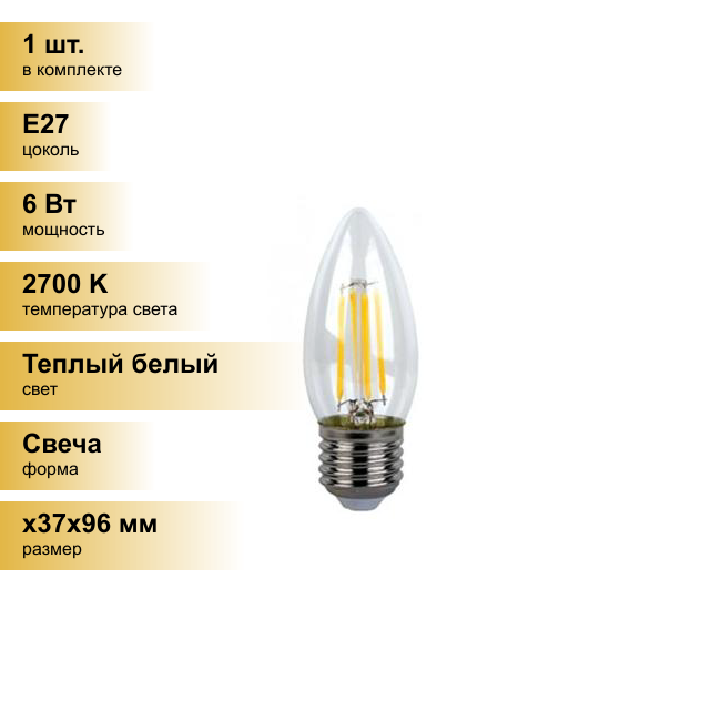 Лампа светодиодная Ecola свеча E27 6W 2700K 2K прозр. 96x37 филамент (нитевидная), 360° N7QW60ELC