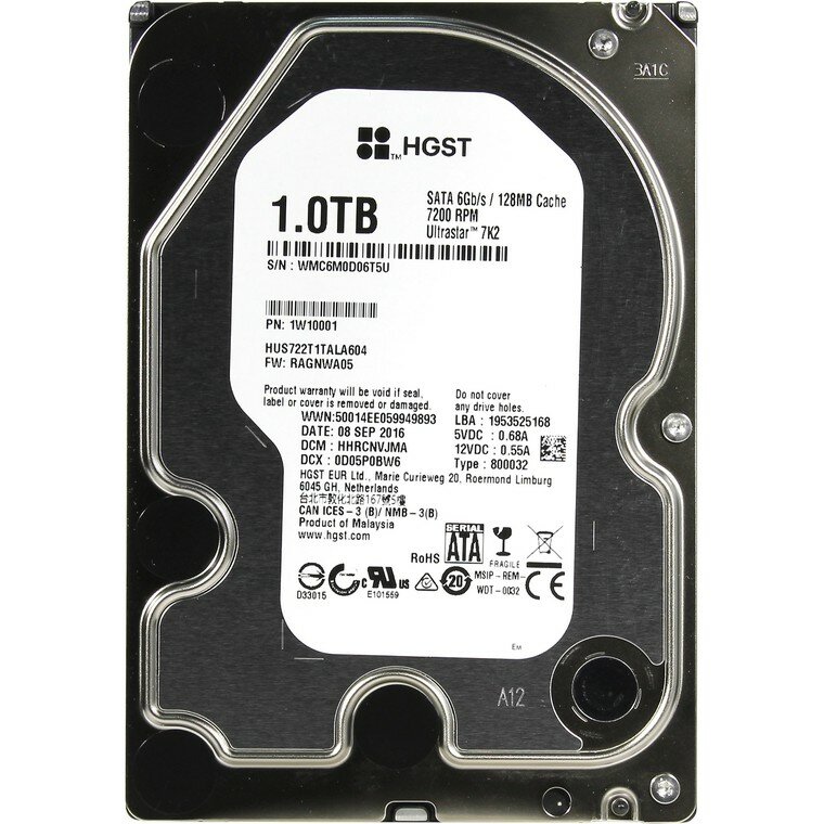 Жесткий диск 3.5" 1Tb , Sata-iii, 128Mb 7200rpm Hgst/wd 1W10001 Ultrastar 7K2 512N HUS722T1TALA604