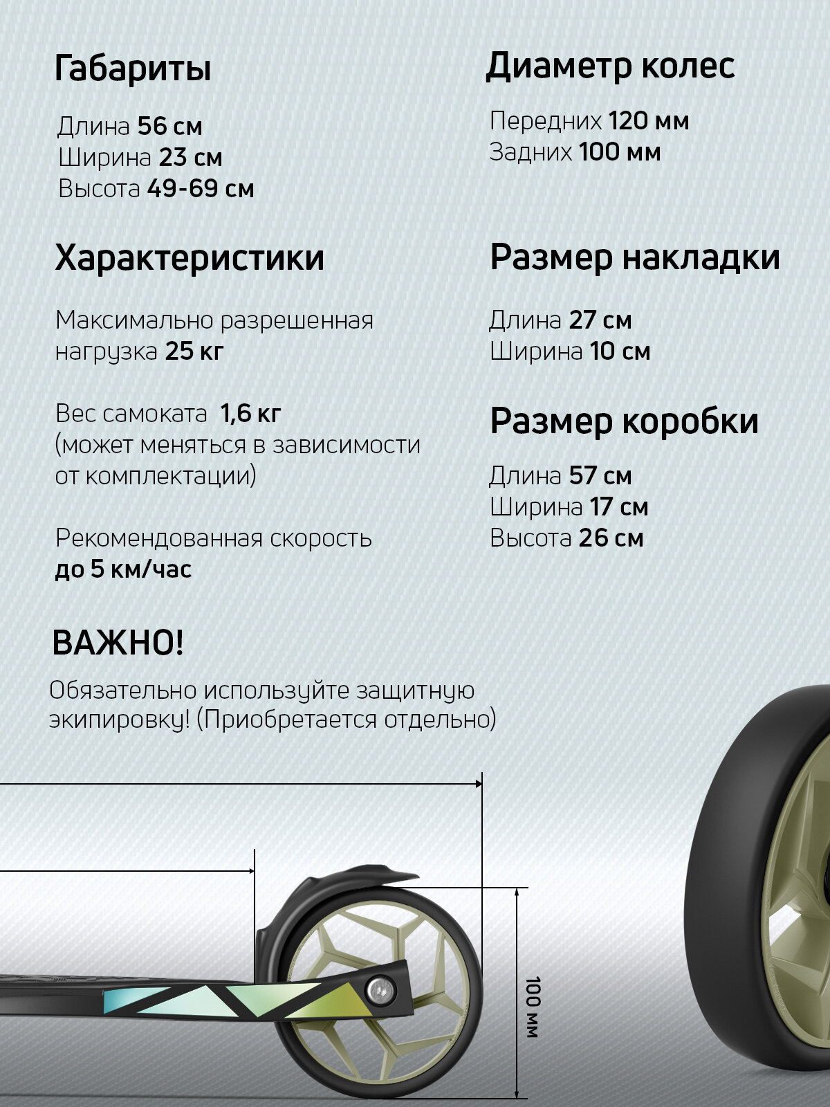 | Дополнительная информация | диаметр заднего колеса: 100 мм; ширина деки: 10 см; класс подшипника: ABEC 7; минимальная высота рулевой стойки: 49 см; вид тормоза: наступной; материал колес: полиуретан; длина деки: 27 см |