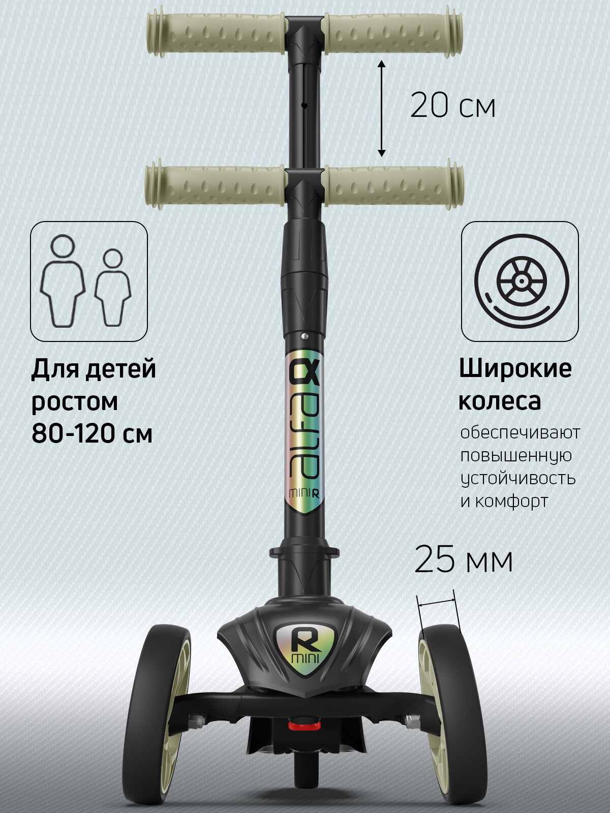 Самокат Alfa Mini R Black (фисташка 32) с не светящимися цветными колесами в коробке. арт. 004-3132