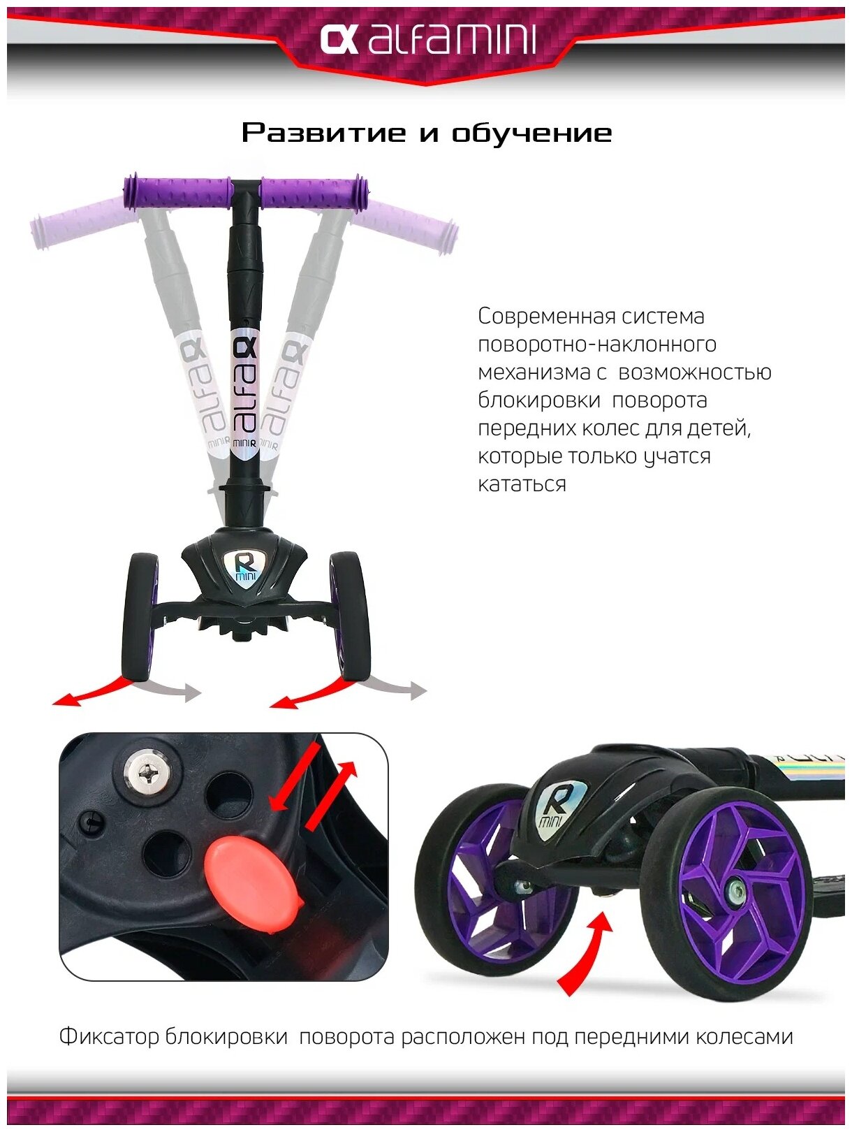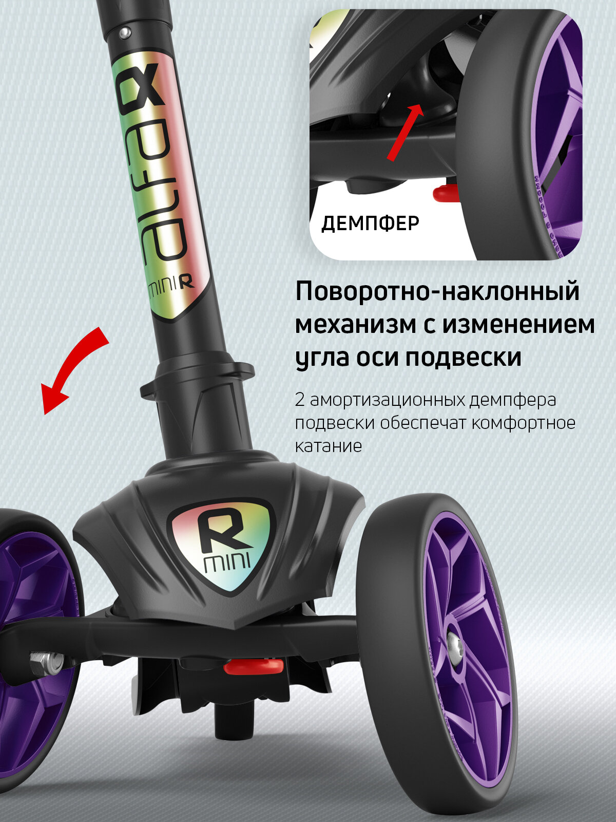 Самокат Alfa Mini R Black (фиолетовый 65) с не светящимися цветными колесами в коробке. арт. 004-3165