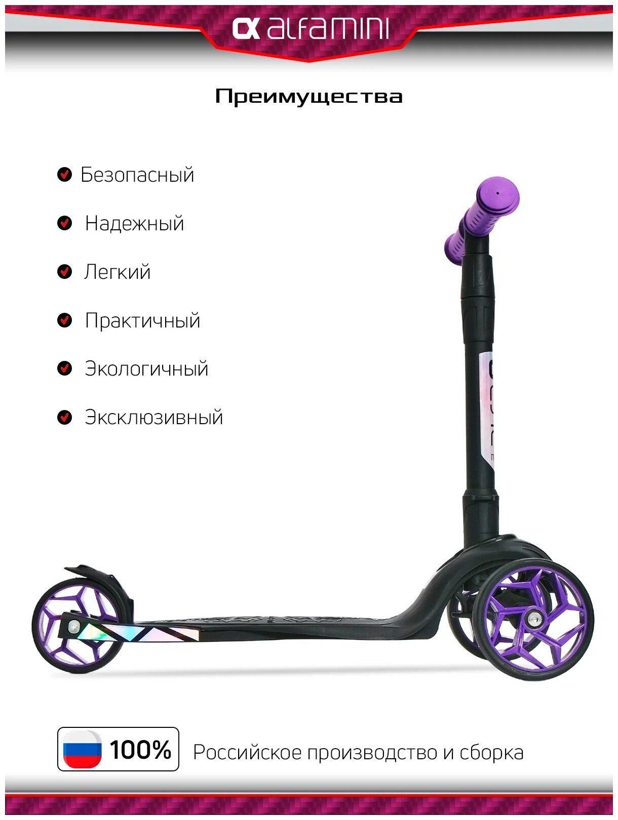 Купить Самокат, самокат трехколесный детский, с цветными колесами и цветными ручками, Buggy Boom Alfa Mini R, фиолетовый