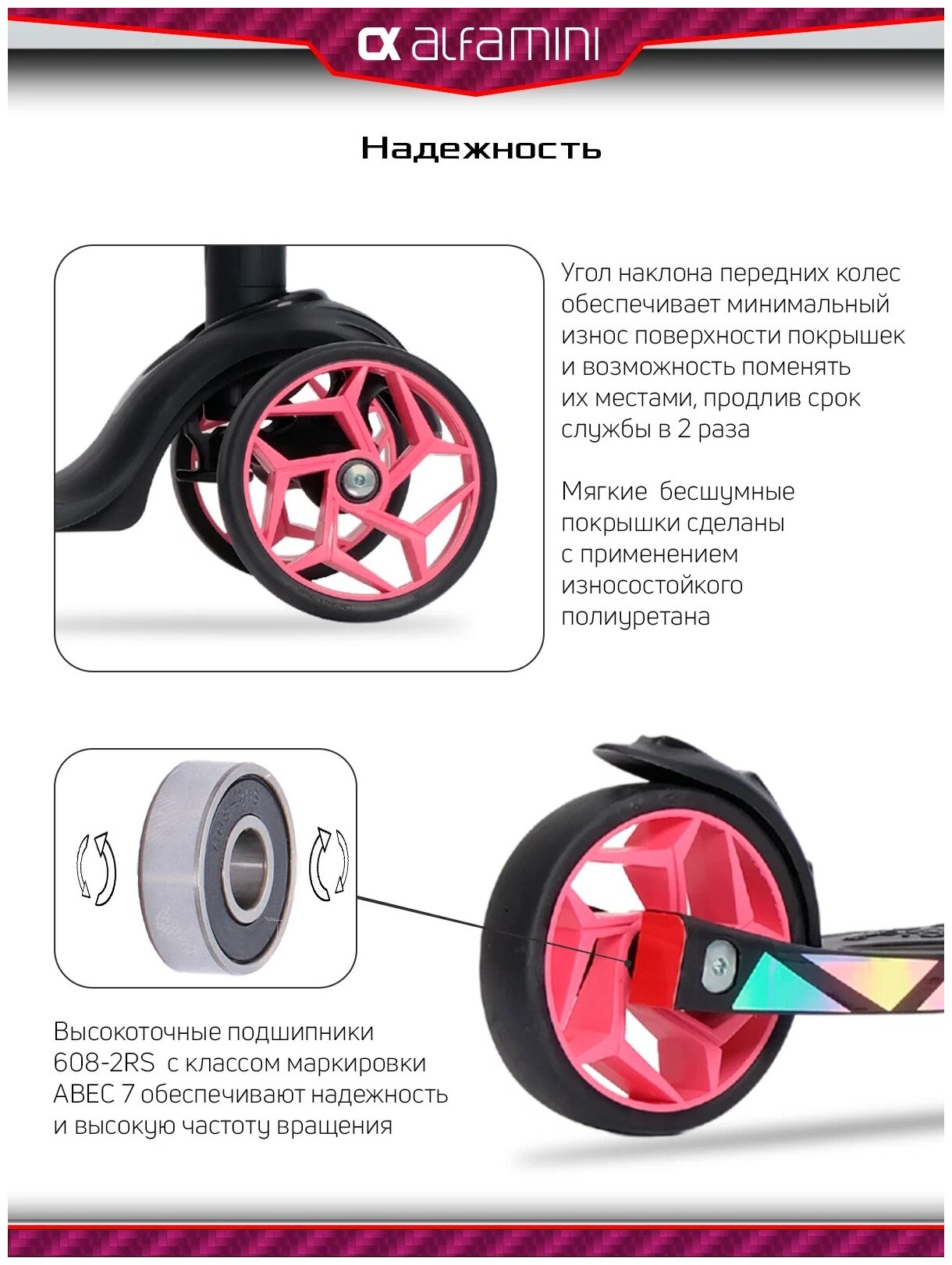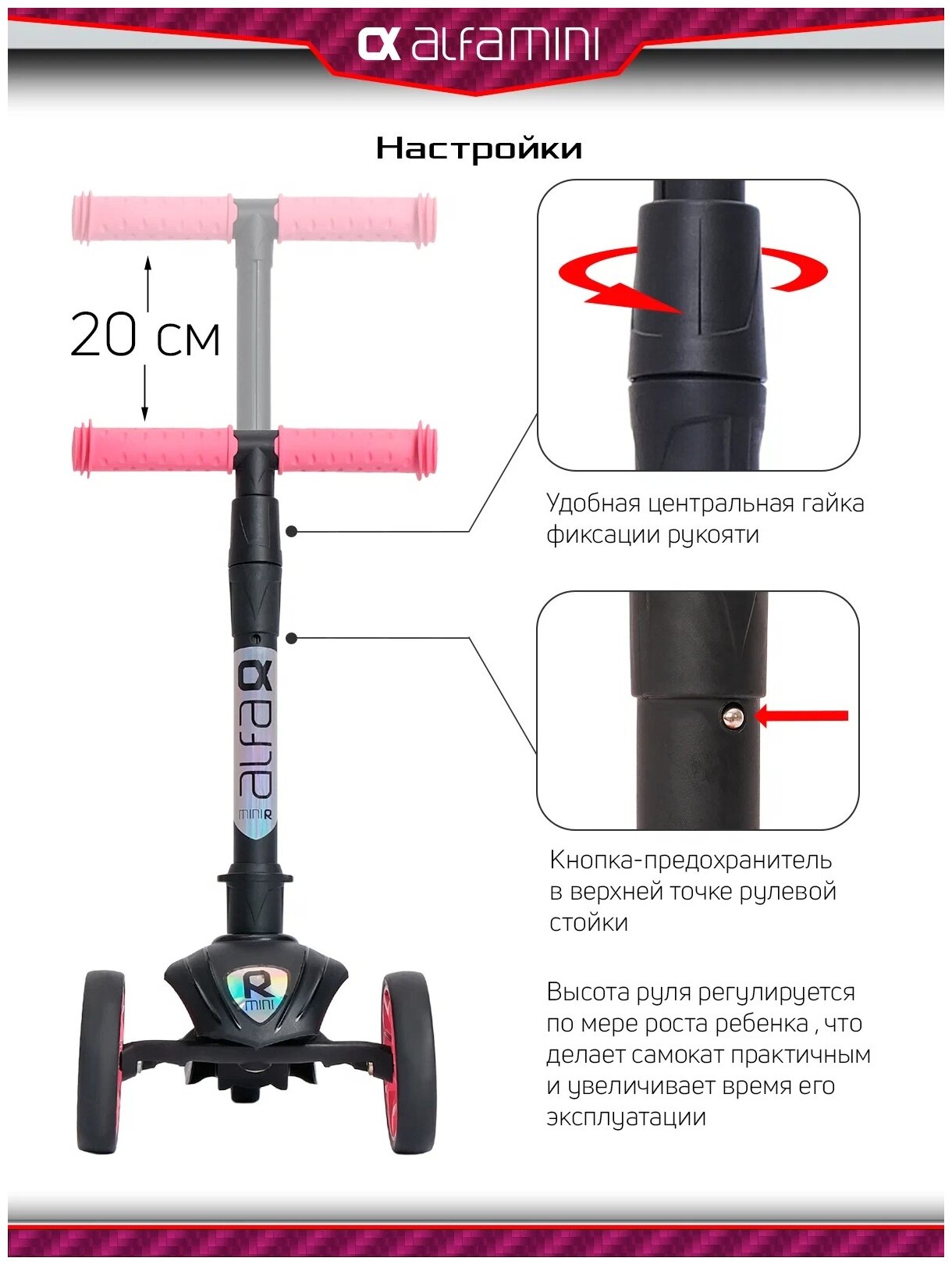 Самокат, самокат трехколесный детский, с цветными колесами и цветными ручками, Buggy Boom Alfa Mini R, ягодный сорбет