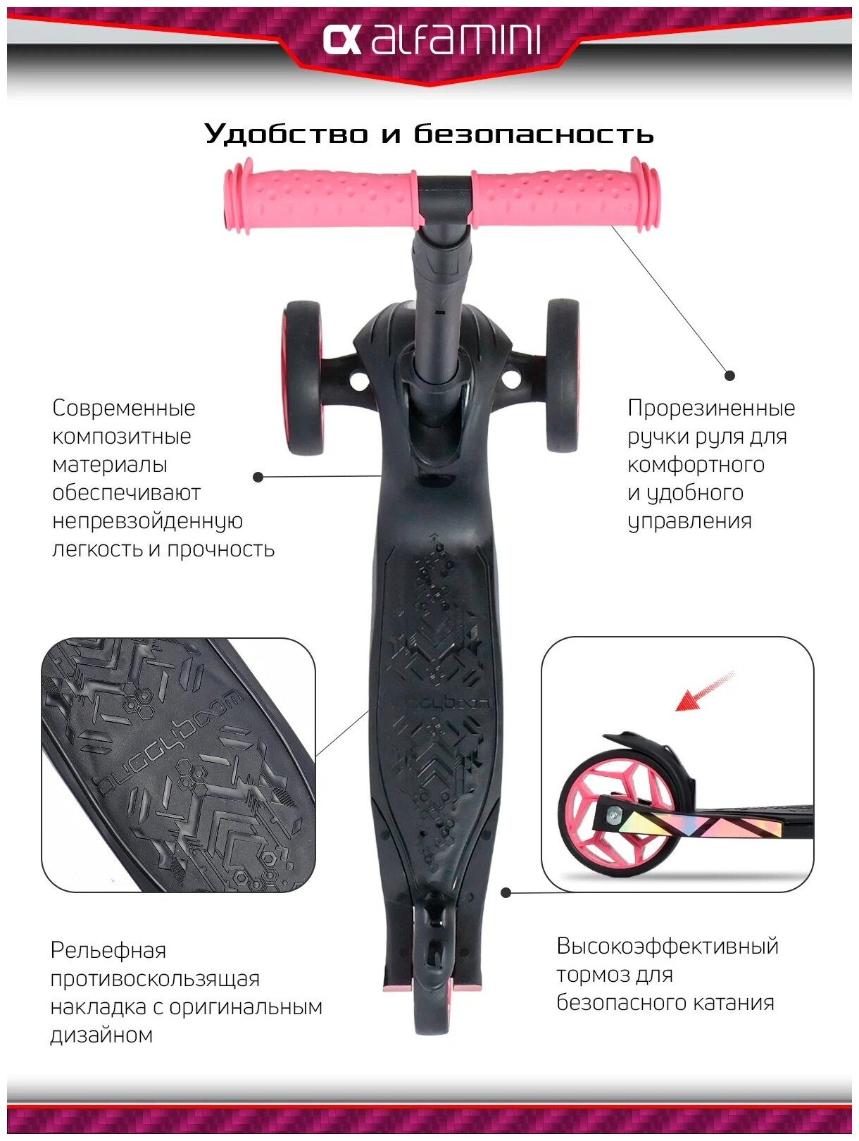 Самокат, самокат трехколесный детский, с цветными колесами и цветными ручками, Buggy Boom Alfa Mini R, рубиновый