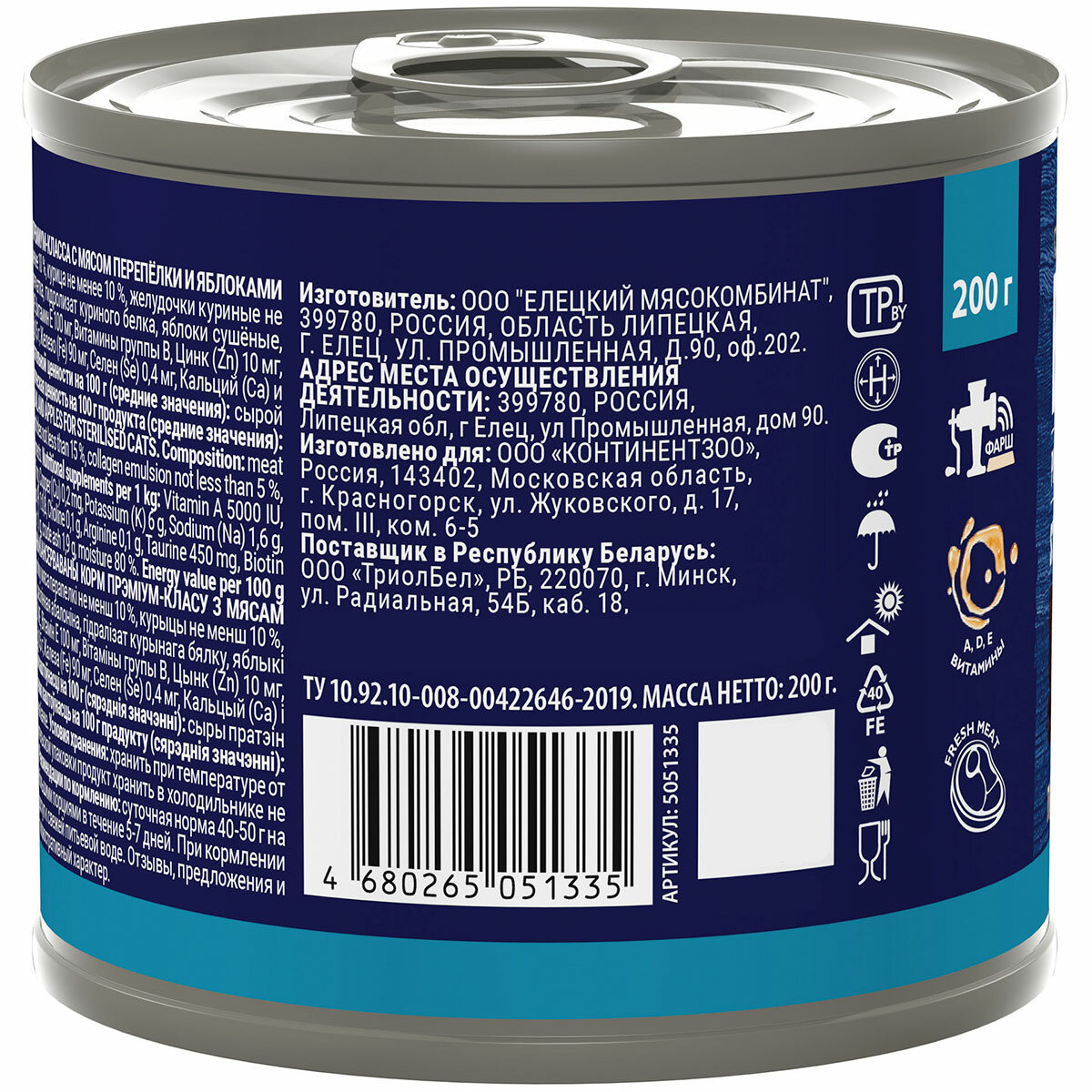 | Состав | мясо и субпродукты (в т.ч. мясо перепелки не менее 10 %, курица не менее 10 %, желудочки куриные не менее 15 %, коллагеновая эмульсия не менее 5 %, печень не менее 3 %), растительная клетчатка, гидролизат куриного белка, яблоки сушеные, витамины группы B, РР, K, Na, Mg, Fe, Cu, I, Se, Са и Р (1 / 0,8), витамины (питательные добавки на 100 г): А 500 МЕ, D3 50 ME, Е 5 МЕ |