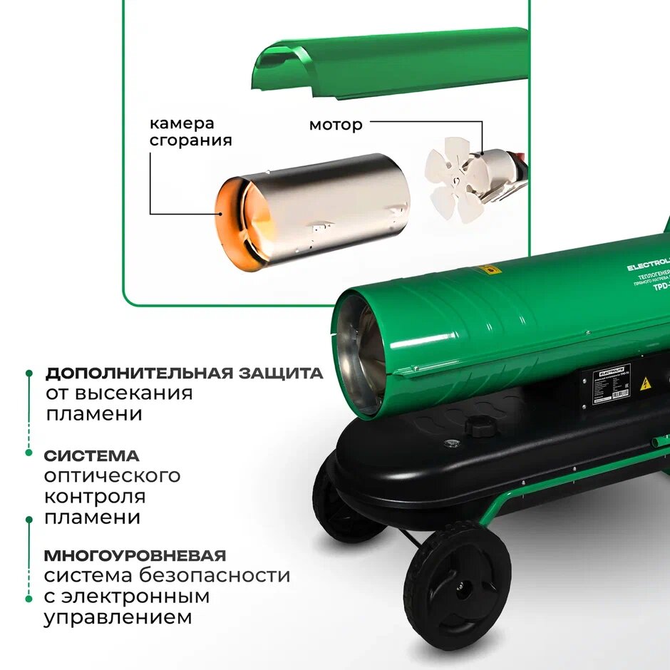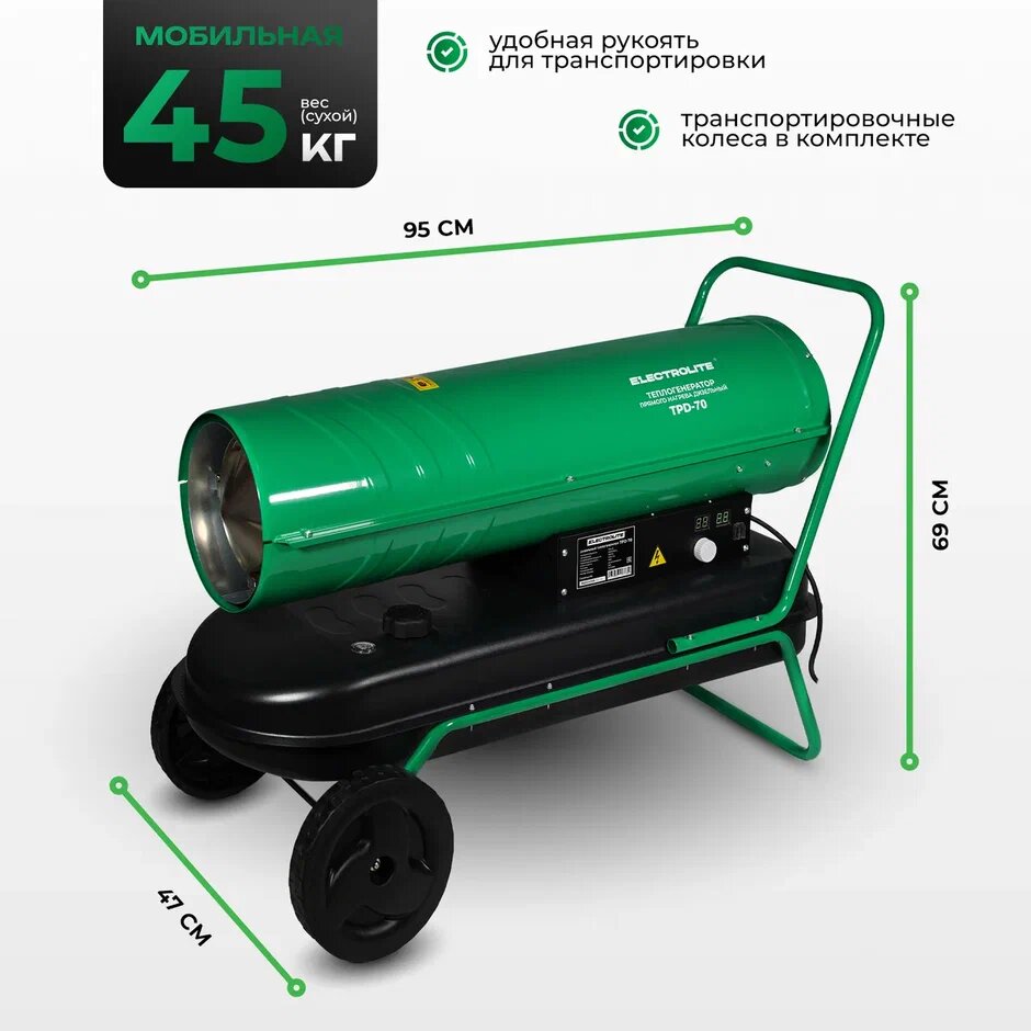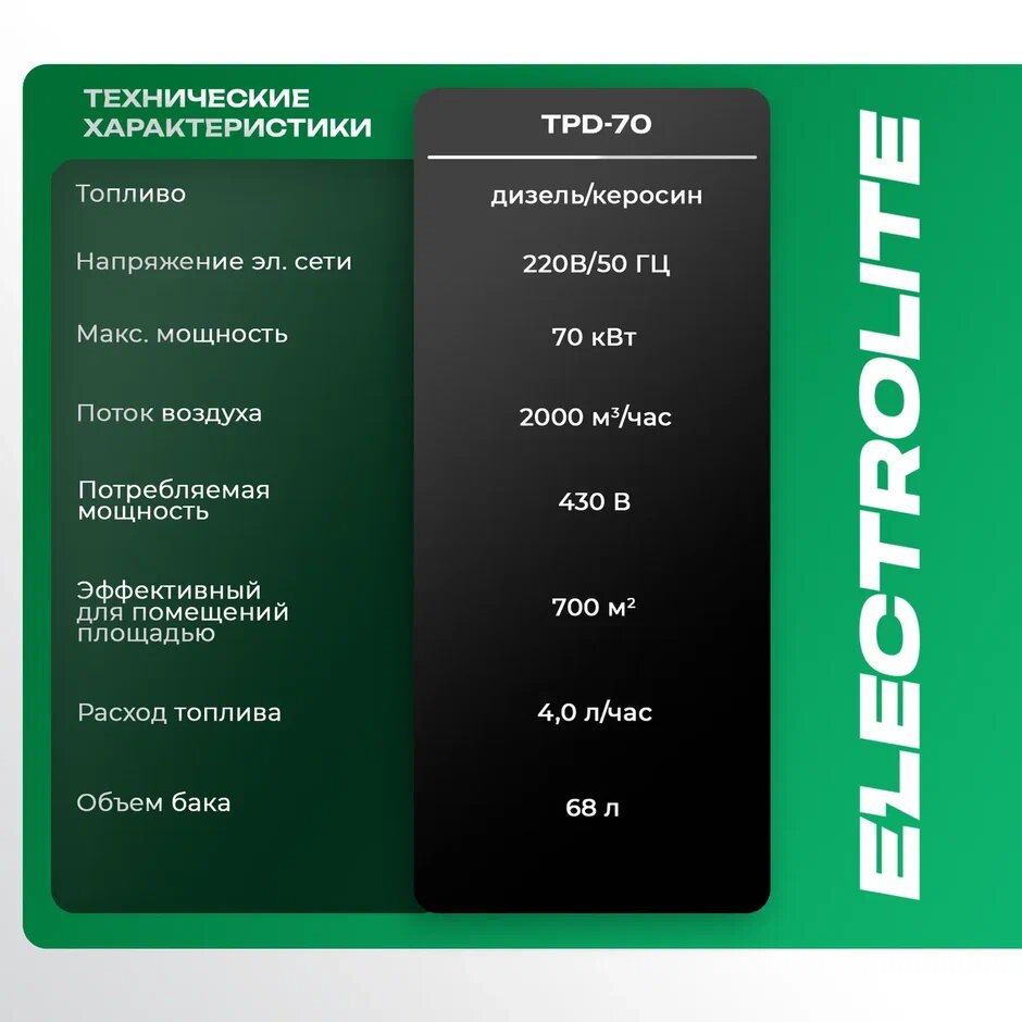 Дизельная тепловая пушка Electrolite TPD-70 (70 кВт; 1500 м3; 4.7 л/ч; прямой нагрев) интересное: