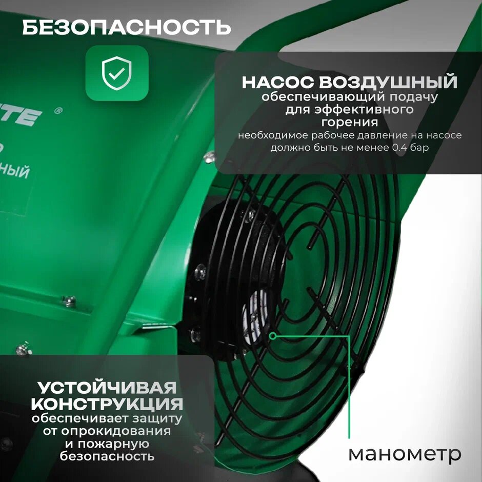 | Подробная комплектация | Пушка тепловая дизельная – 1 шт; Транспортировочное колесо – 2 шт; Рама – 1 шт; Рукоять – 1 шт; Инструкция по эксплуатации – 1 шт; Крепеж в упаковочном пакете – 1 комплект; Упаковка – 1 шт |