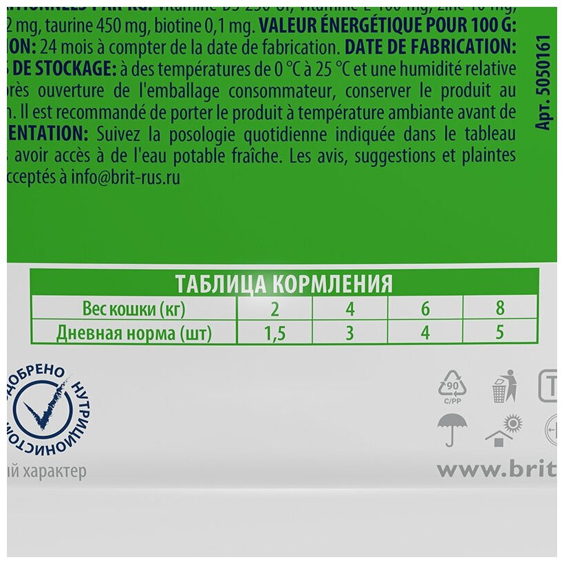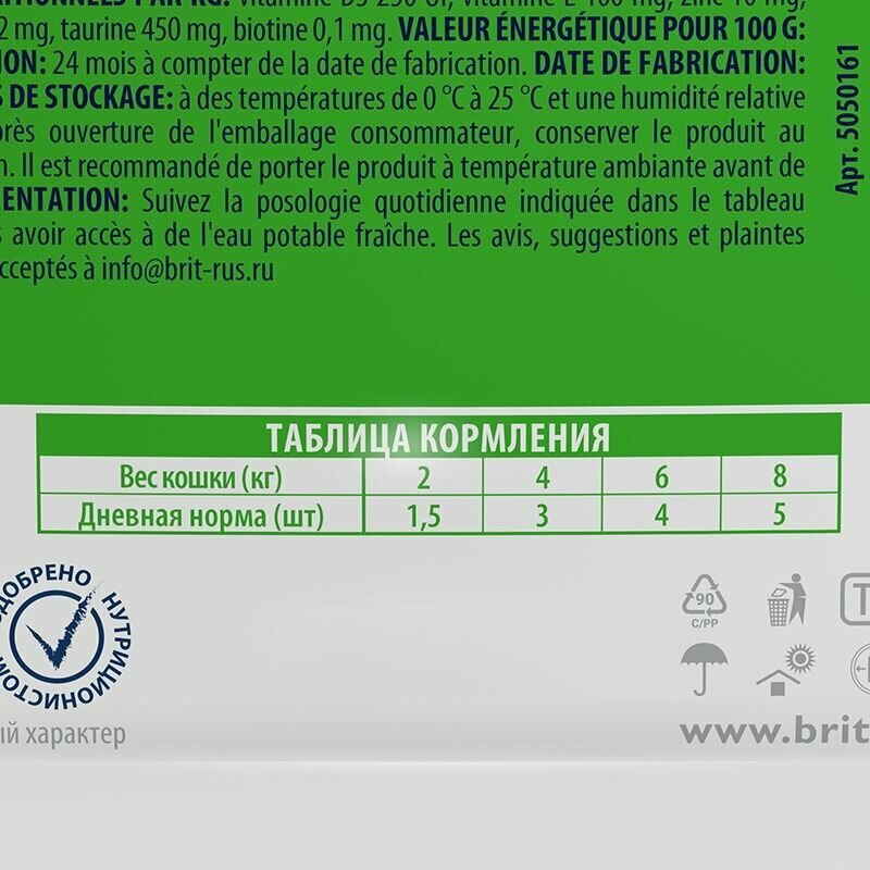 | Минеральные вещества | на 1 кг: цинк 10 мг, марганец 2 мг, йод 0,7 мг, медь 0,2 мг, таурин 450 мг |