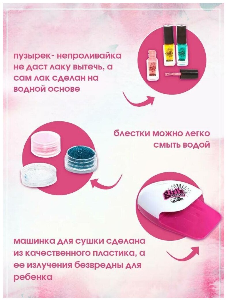 | Комплектация | Сушка для ногтей, лак для ногтей -3шт., пилочка для ногтей, 2-разделителя пальцев, 2-трафарета с наклейками, 2-баночки с блестками. |