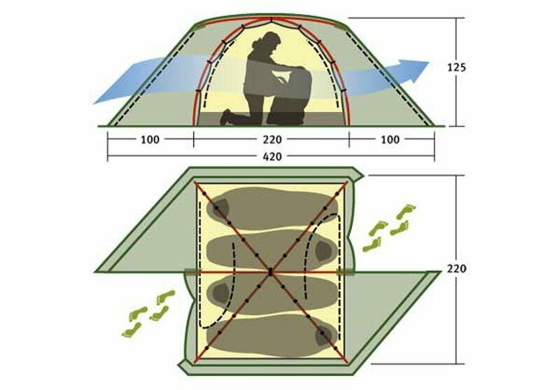 | Габариты внешней палатки(ДxШxВ) | 420x215x125 cм |