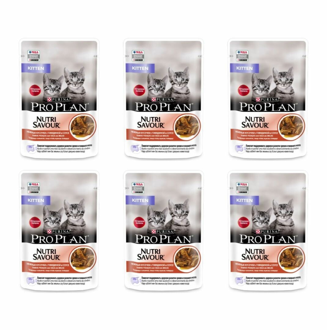 Влажный корм для котят Purina ProPlan (говядина в соусе), 6 шт по 85 гр